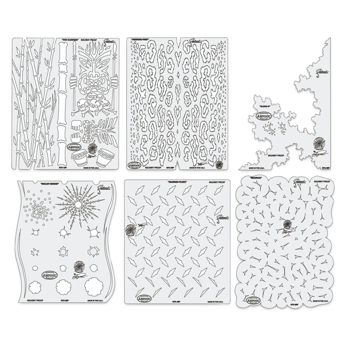 This set contains miniature 5" × 7" versions of the six Kustom FX designs, including Tiki Madness, Bullet Ridden, Cheetah Pimp, Diamond Plate, Cloud 9, and Brainiac.