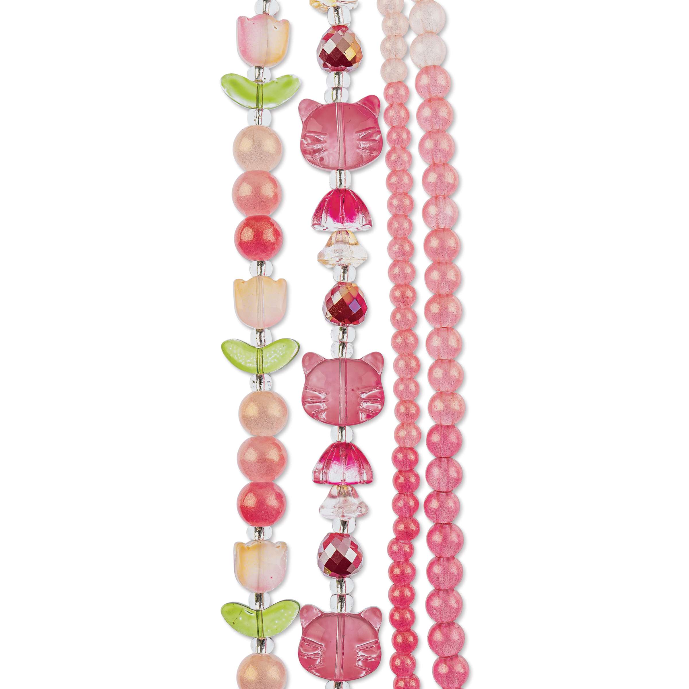 Includes one strand of beads with Pink Tulips (16 mm x 14 mm) and a mix of pink round beads; one strand of beads with Red Cat Heads (12 mm x 14mm), Red Pears (8 mm), Pink Lotus (10 mm), and small Pale Pink Flowers (6 mm x 8 mm); and two strands of round beads in a mix of Pink.