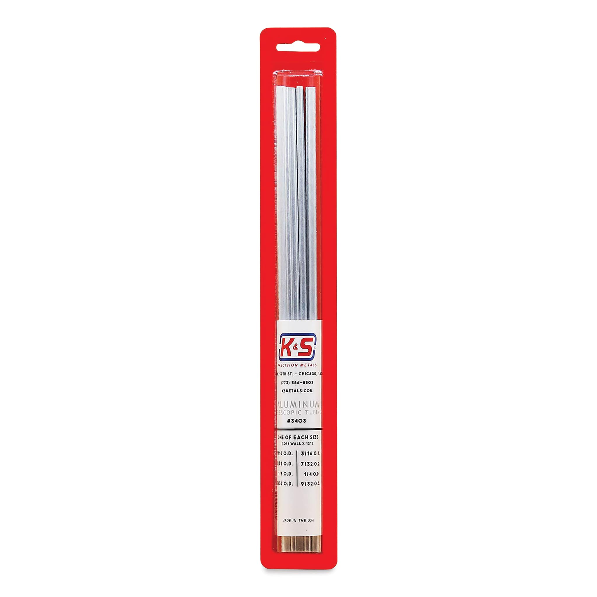 This assortment includes; 12" aluminum tubes measuring 1/16", 3/32", 1/8" 5/32", 3/16", 7/32", 1/4", and 9/32" in diameter.