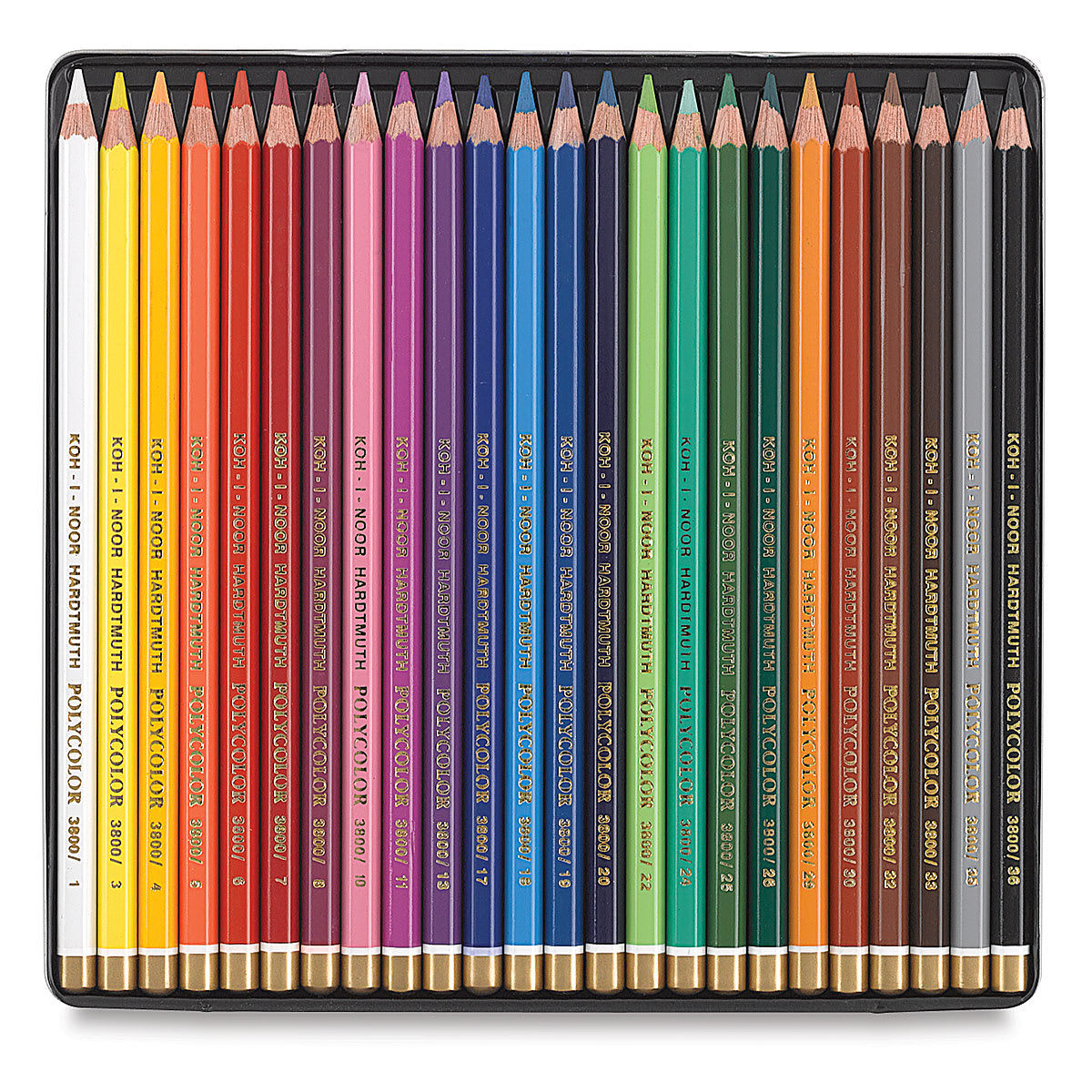 Includes Dark Brown, Burnt Ochre, Light Brown, Raw Umber, Dark Green, Olive Green Dark, Grass Green, Meadow Green, Apple Green, Yellowish Green, Flesh, Sapphire Blue, Cobalt Blue Dark, Ice Blue, Cerulean Blue, Azure Blue, Light Blue, Mountain Blue, Vermilion Red, Chromium Orange, Light Ochre, Lemon Yellow, White.