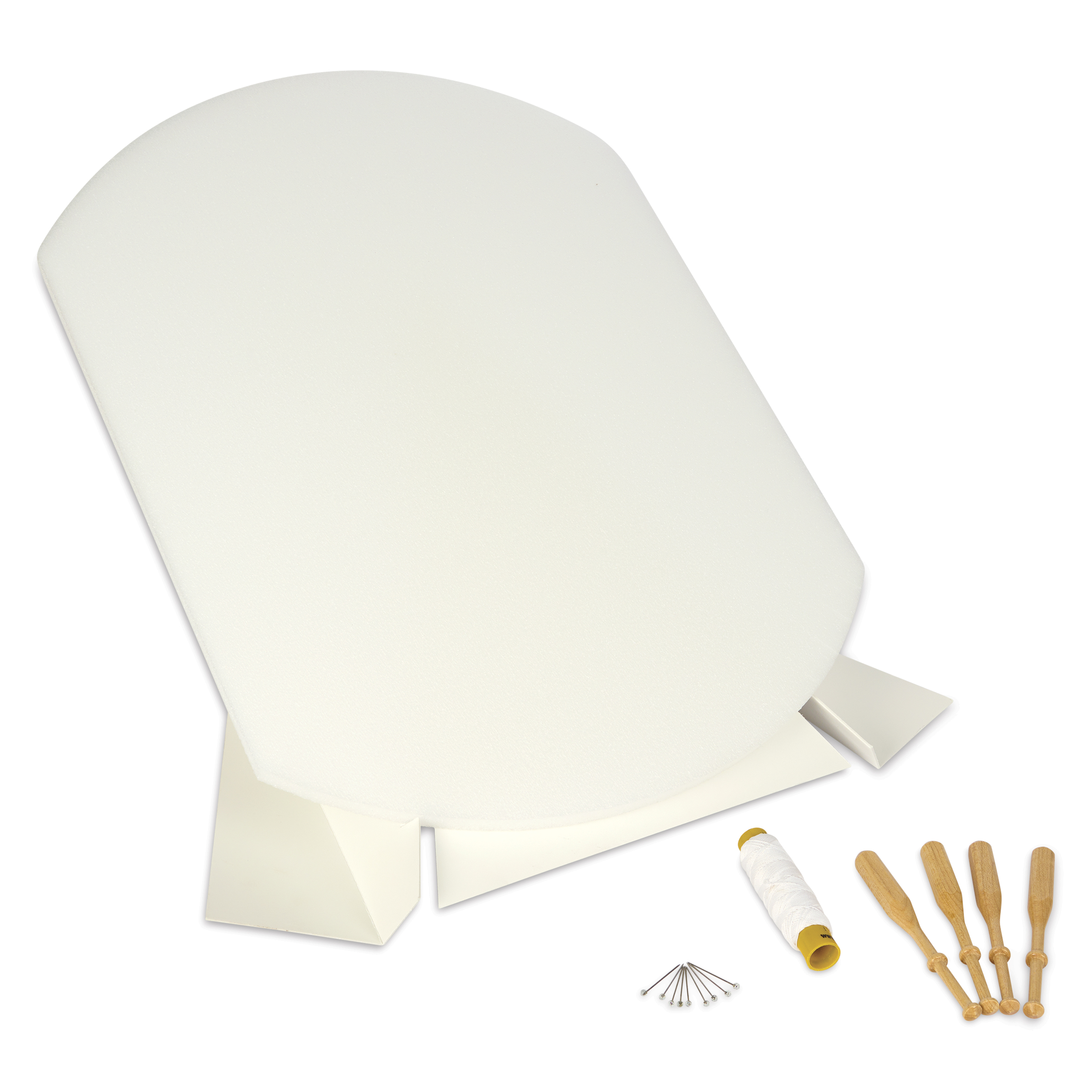 This kit includes 24 lace bobbins, DMC cotton thread, workboard, work stand, pins, and illustrated instructions