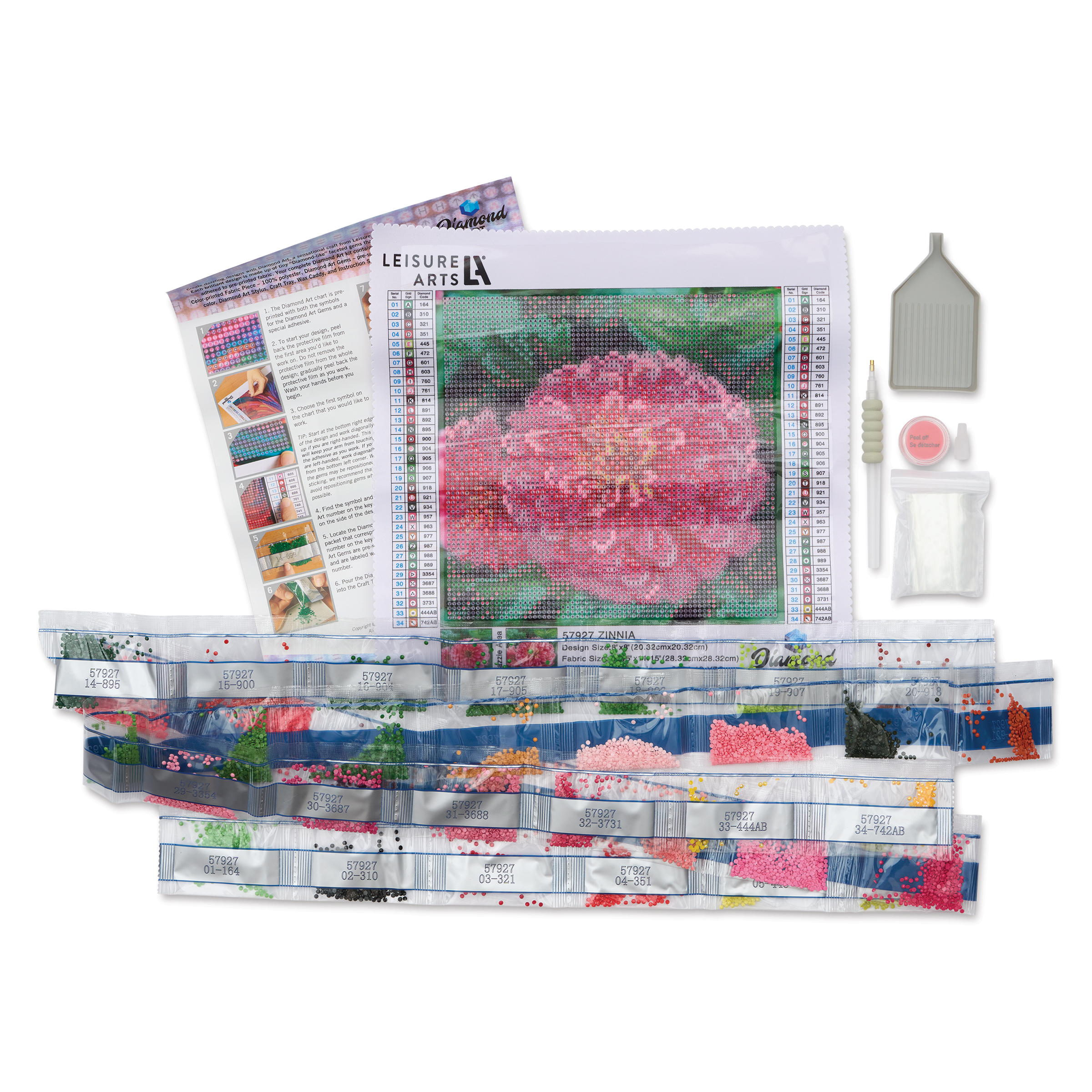 The canvas measures 11-1/5" L x 11-1/5" W (28.45 cm x 28.45 cm) and the finished piece measures 8" L x 8" W (20.3 cm x 20.3 cm). The kit comes with 2 oz of pre-sorted diamond art gems. Great for beginner diamond painters.