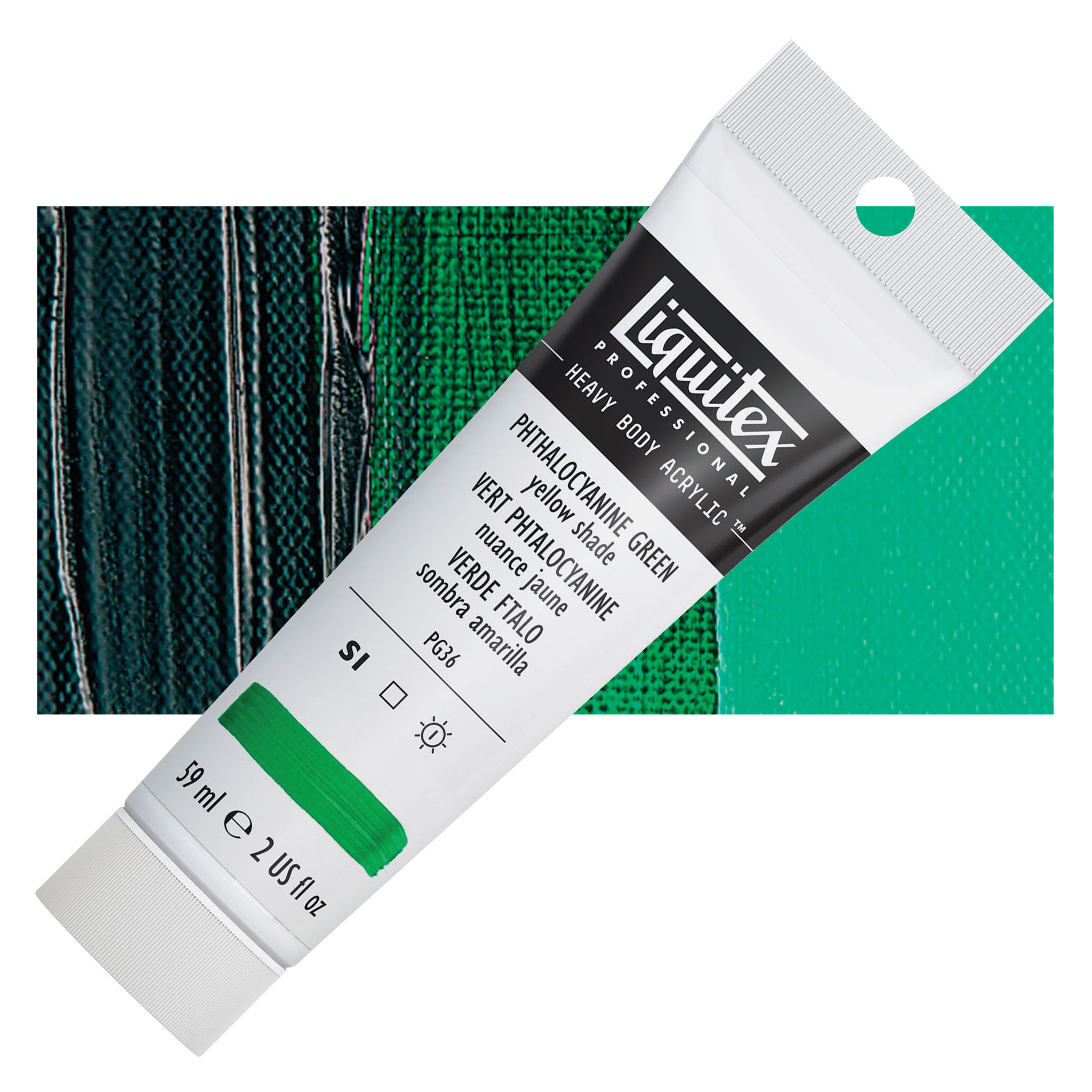 Phthalo Green is a transparent, cool, bright, high intensity color used in oil and acrylics. It comes from a Phthalocyanine Blue pigment where most of the hydrogen atoms have been replaced with chlorine, forming highly stable molecules. Pigment PG36 differs from PG7 in that a portion of the chlorine atoms are replaced with bromine atoms, which are reactively similar, but cause a yellow shift that is especially noticeable in mixtures. Phthalo Green has similar pigment properties and permanence to Phthalo Blue. It is slow drying and an excellent base color for mixing a range of bright greens. Phthalo Green is considered a very good alternative to Viridian because it is intense and mixes well and can be used to emphasize mineral colors in various tints. However, its tinting strength is very high, so it can overpower other colors. This pigment most closely resembles the discontinued and toxic Verdigris.
