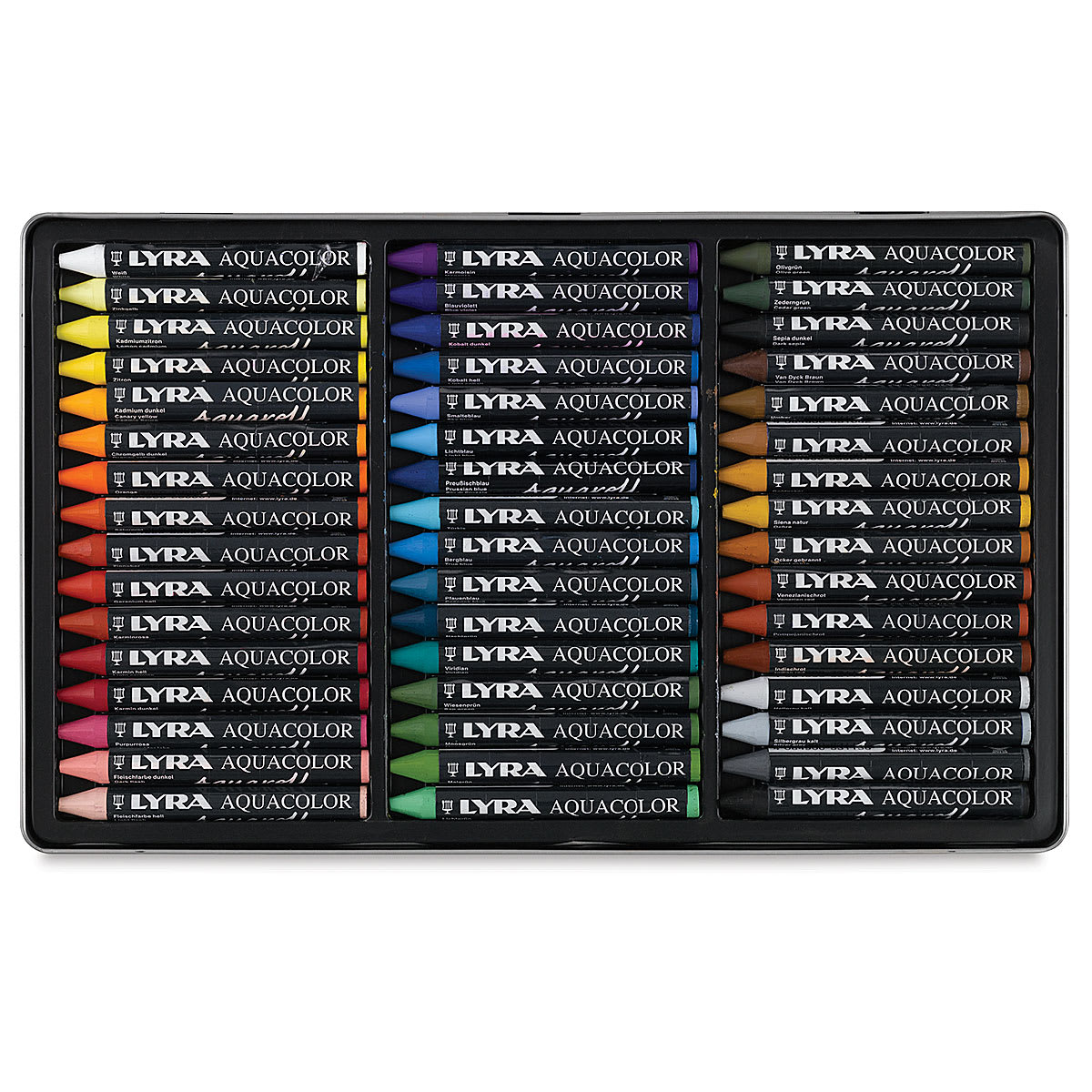This set includes White, Zinc Yellow, Lemon Cadmium, Lemon, Canary Yellow, Orange Yellow, Light Orange, Dark Orange, Vermillion, Pale Geranium Lake, Rose Carmine, Dark Carmine, Light Carmine, Rose Madder Lake, Dark Flesh, Light Flesh, Magenta, Blue Violet, Deep Cobalt, Light Cobalt, Sky Blue, Light Blue, True Blue, Prussian Blue, Peacock Blue, Aquamarine, Night Green, Viridian, Sap Green, Moss Green, Apple Green, Light Green, Olive Green, Cedar Green, Dark Sepia, Van Dyke Brown, Raw Umber, Brown Ochre, Gold Ochre, Ochre, Burnt Ochre, Venetian Red, Pompeian Red, Indian Red, Light Grey, Silver Grey, Medium Grey, and Black.