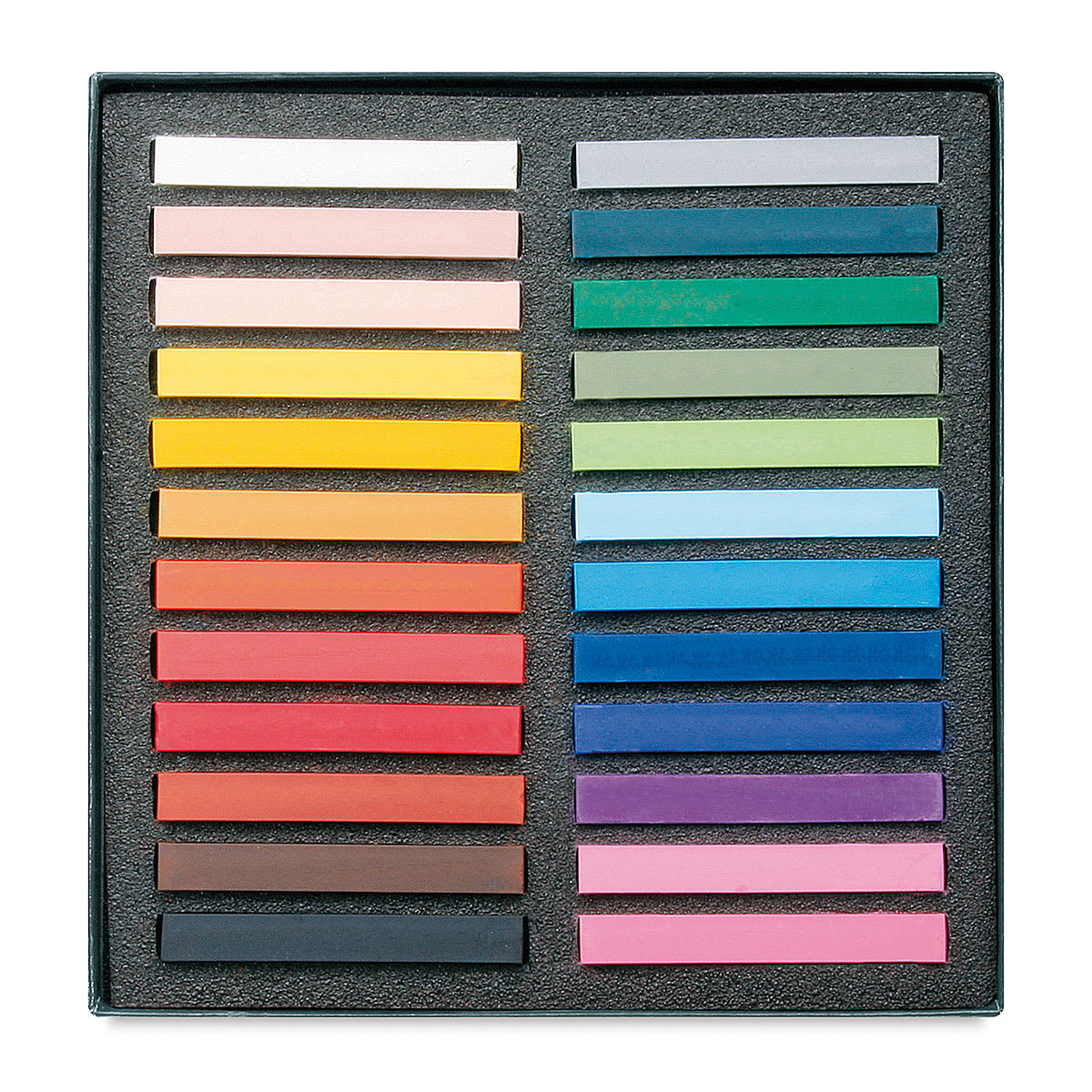 This set includes Pale Geranium Lake, Dark Orange, Violet, Light Flesh, White, Light Chrome, Paris Blue, Aquamarine, Silver Gray Warm, Sap Green, Venetian Red, Black, Pink Madder Lake, Cedar Green, Light Cobalt, Van Dyck Brown, Canary Yellow, Viridian, Prussian Blue, Magenta, Vermillion, Dark Flesh, Rose Madder Lake, and Light Gray.