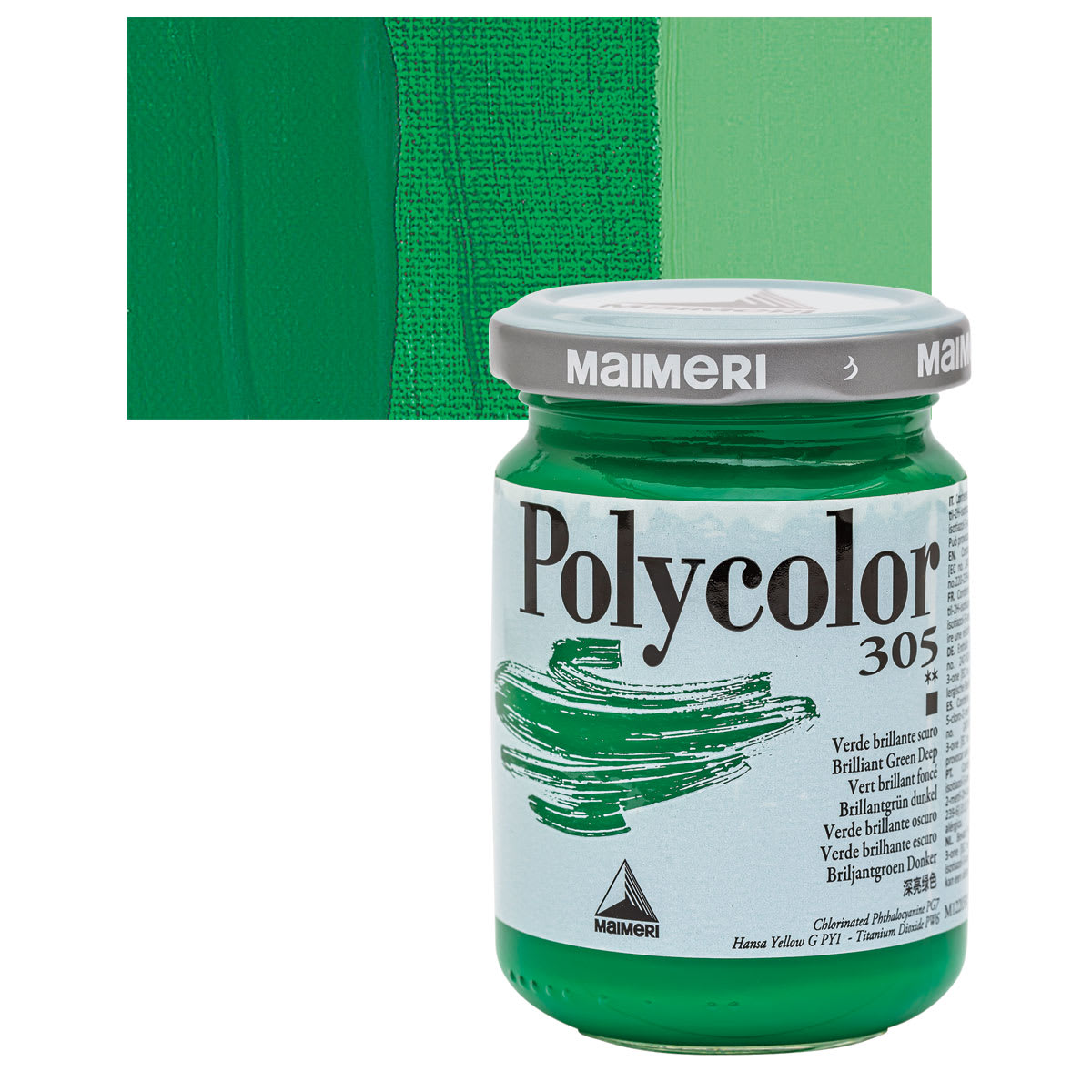 Maimeri Polycolor Vinyl Paint - Brilliant Green Deep, 140 ml jar and swatch