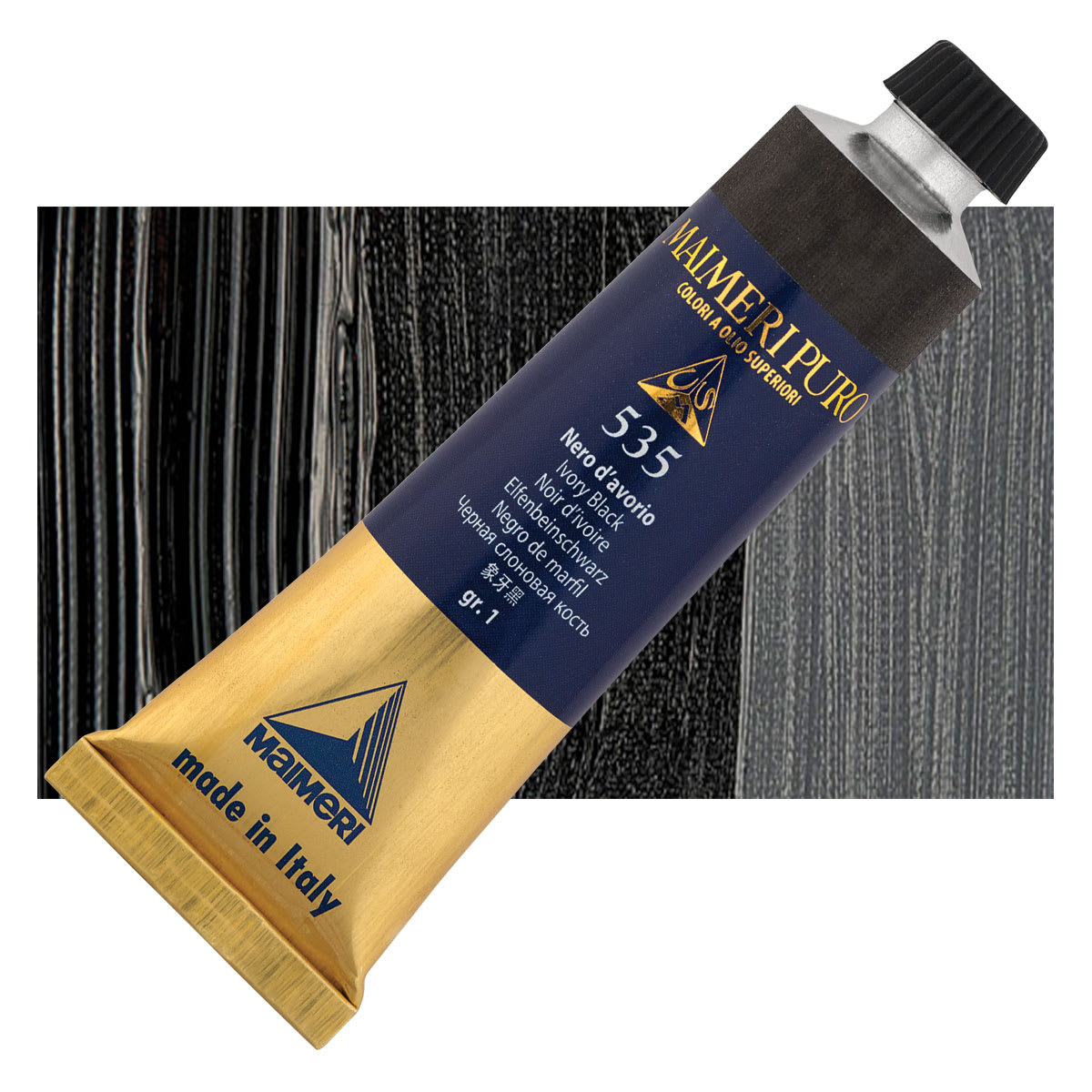 Ivory Black is a cool, semi-transparent blue-black with a slight brownish undertone and average tinting strength. It mixes well with any color, and creates a range of dull greens when mixed with yellow. It has good properties for use in oil, can be slow to dry in oil form, and should never be used in underpainting or frescoing. Ivory Black is denser than Lamp Black.