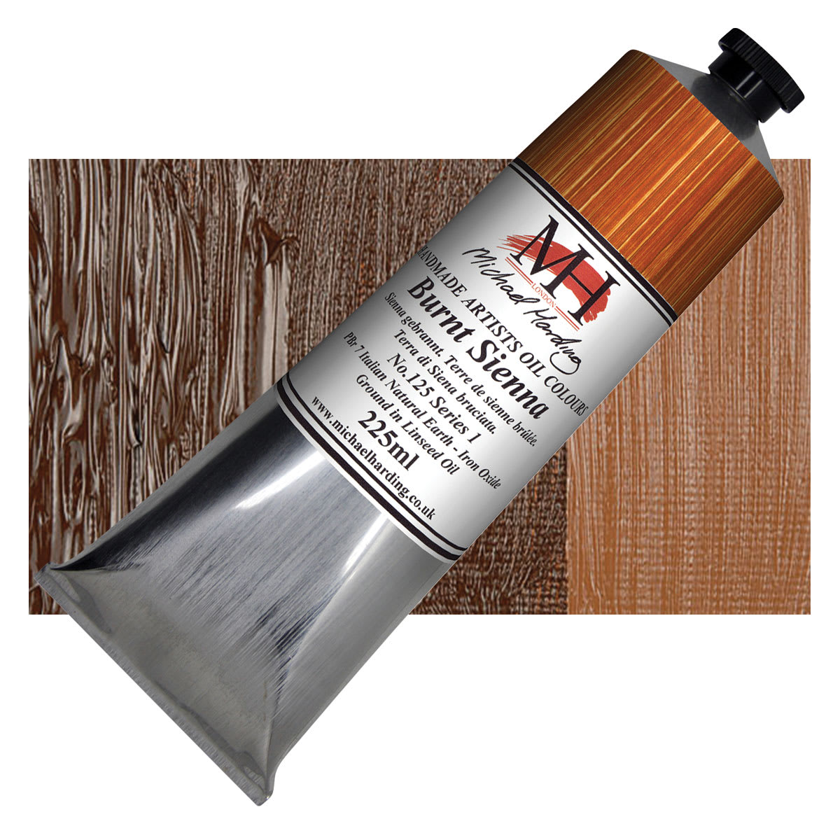 Burnt Sienna is a warm, mid-brown color formed by burning the yellow-brown limonite clay called Raw Sienna. It ranges from semi-opaque to semi-transparent due to the combination of its opaque, red-brown mass tone and its transparent, orangey undertone. It is an excellent mixing complement for blues and greens and creates salmon or peach colored tints when mixed with white. It can be useful for subduing bright colors and does not get chalky in dark mixtures.