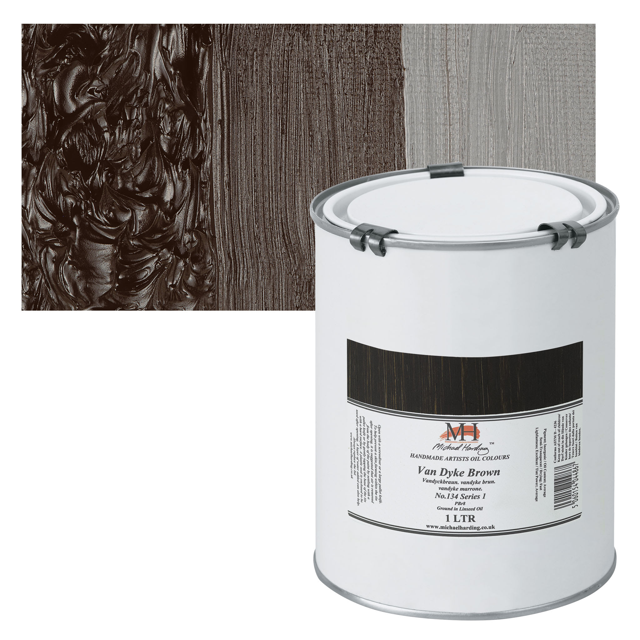 Michael Harding Artists Oil Paint - Van Dyke Brown, 1 Liter and swatch