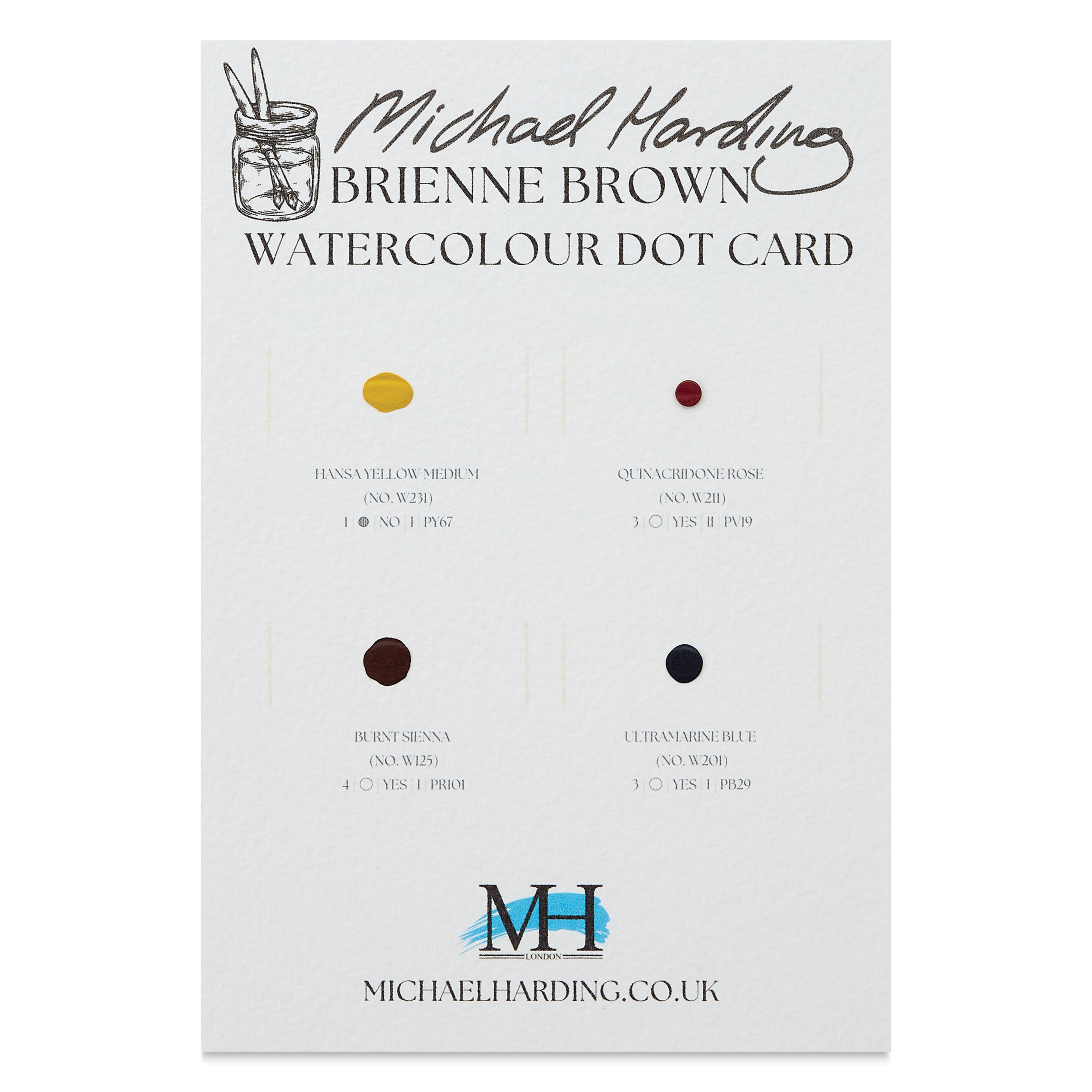 This dot card includes dots of Burnt Sienna, Ultramarine Blue, Quinacridone Rose, and Hansa Yellow Medium.