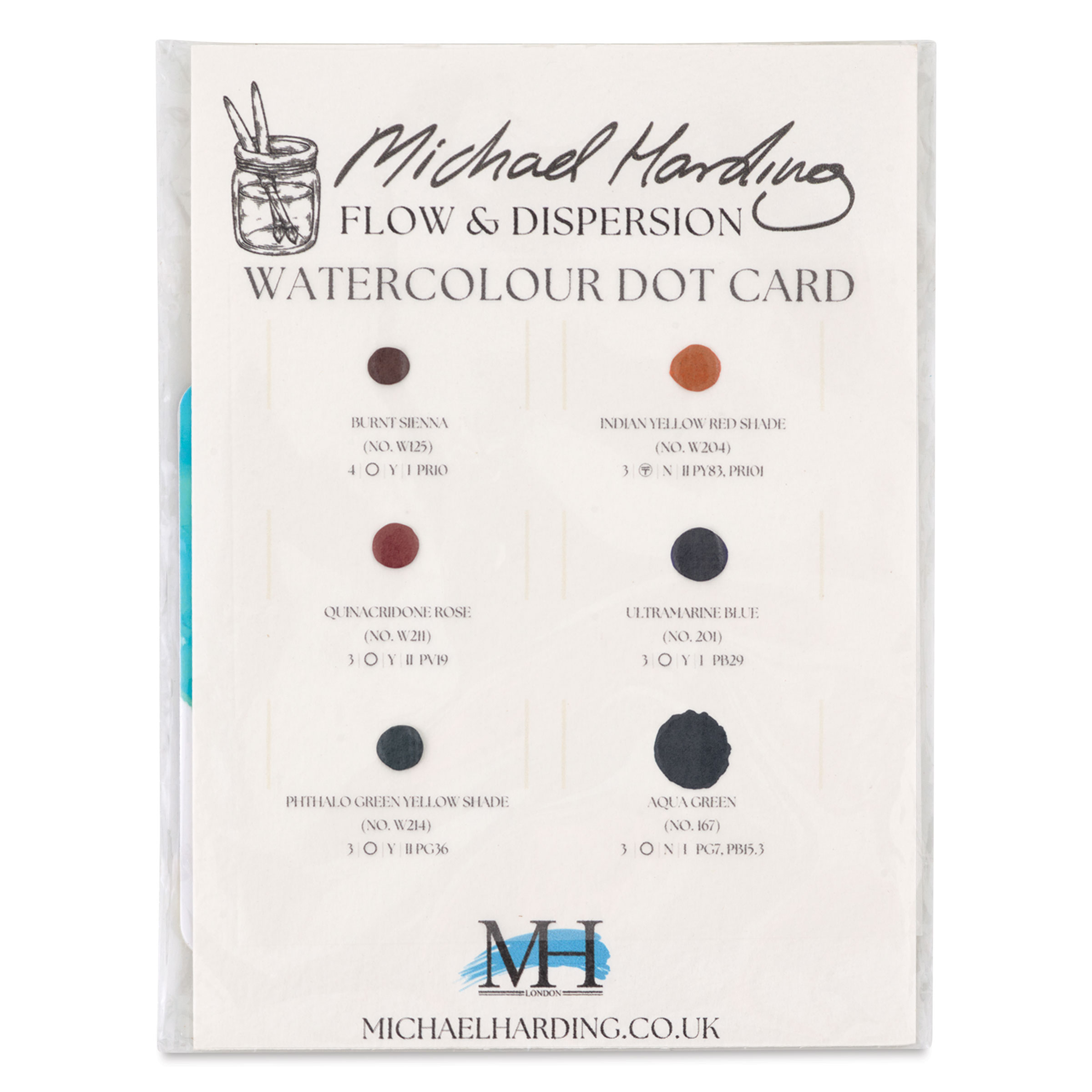 This dot card includes Burnt Sienna, Aqua Green, Ultramarine Blue, Indian Yellow Red Shade, Quinacridone Rose, Phthalocyanine Green Yellow Shade.