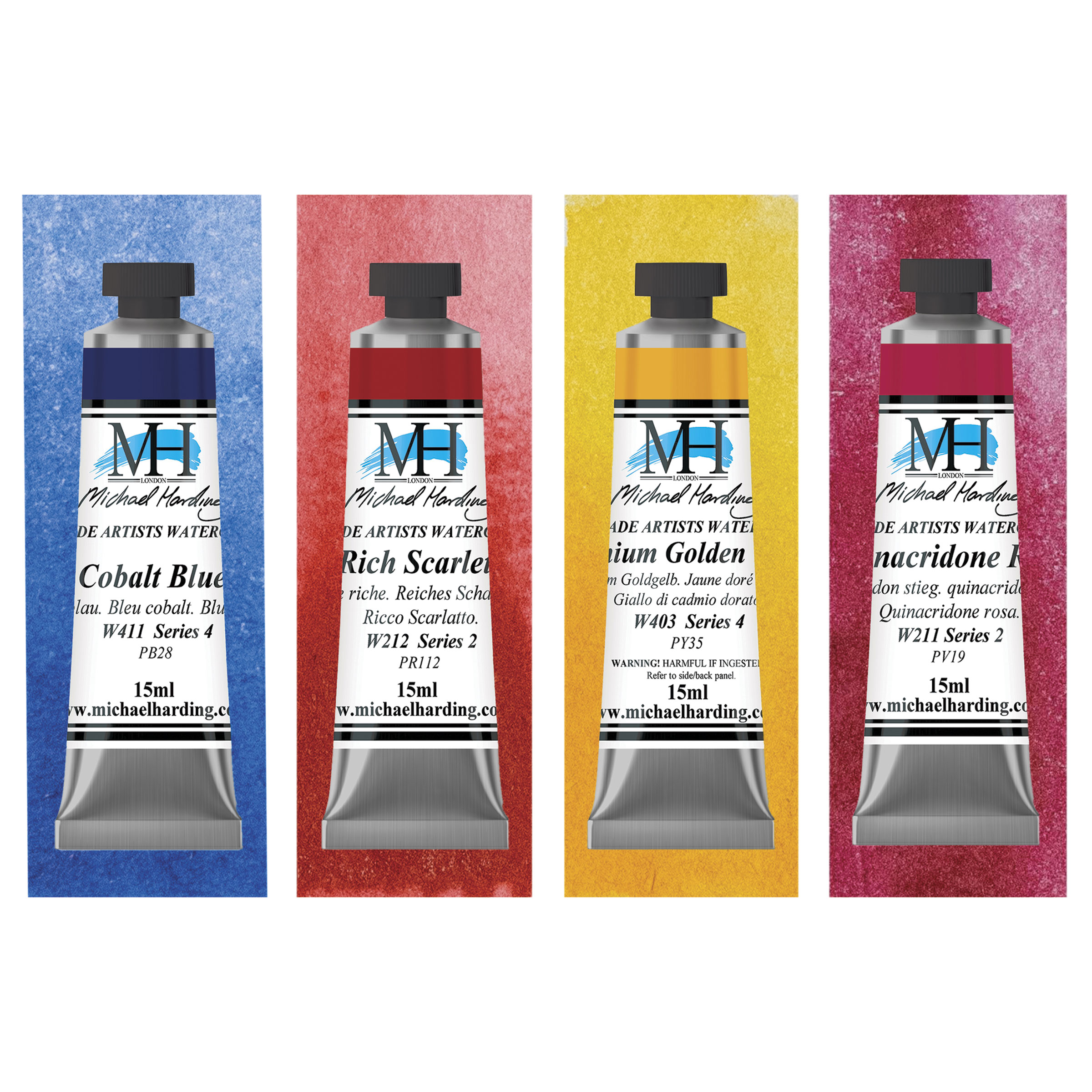 Includes 411 Cobalt Blue, 212 Rich Scarlet, 403 Cadmium Golden Yellow, and 211 Quinacridone Rose.