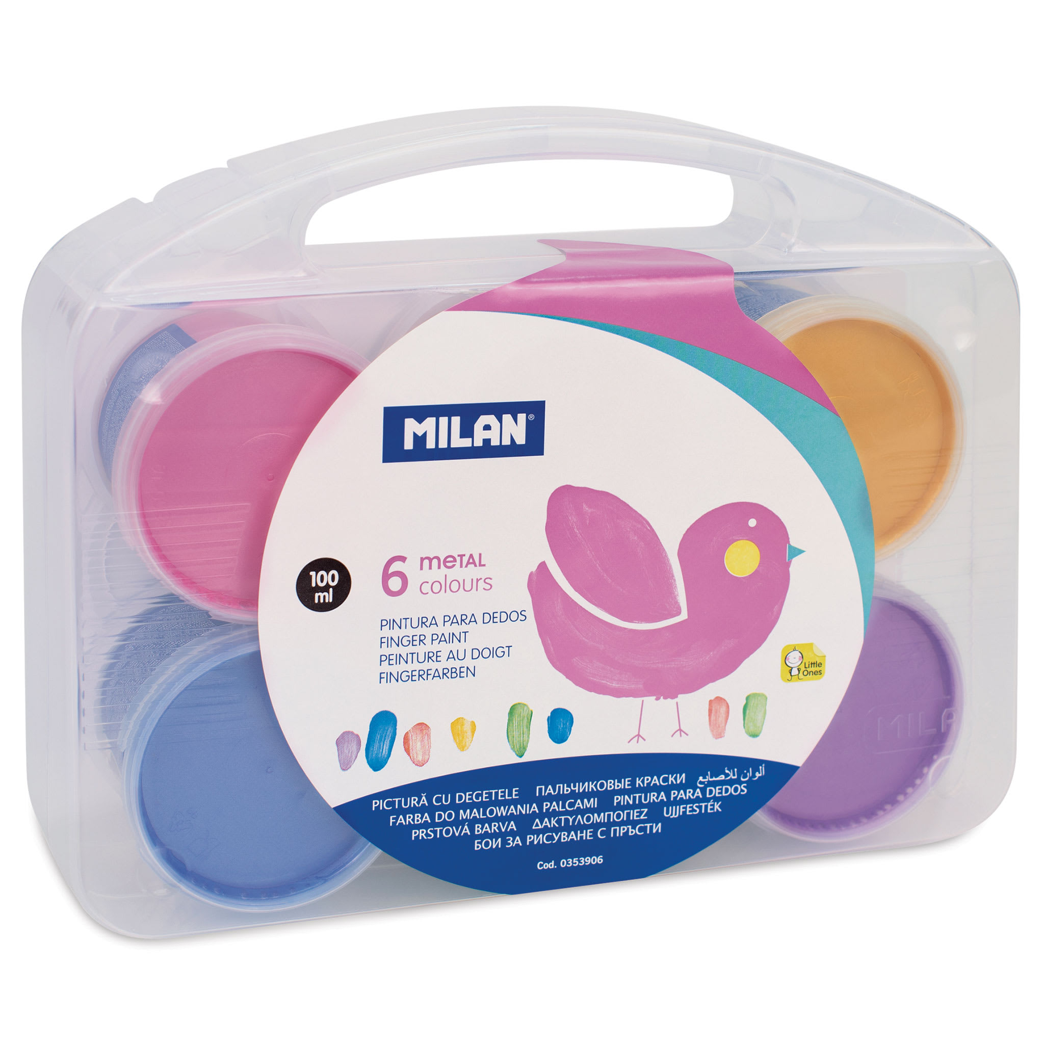 Includes six 100 ml pots of Yellow, Orange, Pink, Purple, Blue, and Green in a transparent carrying case.