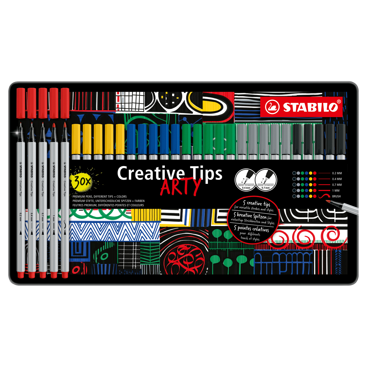 Multi-liner STABILO Creative Tips Sets 30-Piece ARTY Metal Tin Set - One each of Ultramarine, Green, Yellow, Black, Carmine and Medium Cold Grey fineliner in 0.2mm, 0.4mm, 0.7mm, 1mm and brush tips.