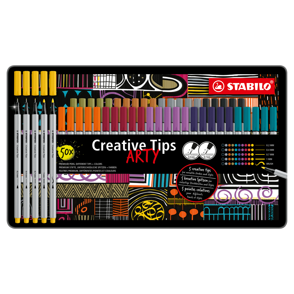 Multi-liner STABILO Creative Tips Sets 50-Piece ARTY Metal Tin Set - One each of Purple, Prussian Blue, Pale Vermillion, Mud Green, Yellow, Black, Turquoise Blue, Plum, Dark Ochre and Medium Cold Grey fineliner in 0.2mm, 0.4mm, 0.7mm, 1mm and brush tips.