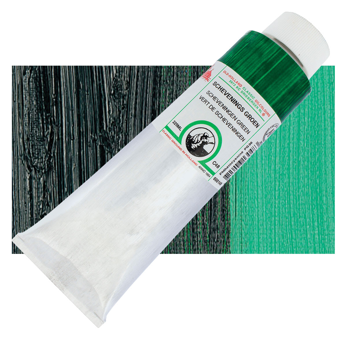 Phthalo Green is a transparent, cool, bright, high intensity color used in oil and acrylics. It comes from a Phthalocyanine Blue pigment where most of the hydrogen atoms have been replaced with chlorine, forming highly stable molecules. Pigment PG36 differs from PG7 in that a portion of the chlorine atoms are replaced with bromine atoms, which are reactively similar, but cause a yellow shift that is especially noticeable in mixtures. Phthalo Green has similar pigment properties and permanence to Phthalo Blue. It is slow drying and an excellent base color for mixing a range of bright greens. Phthalo Green is considered a very good alternative to Viridian because it is intense and mixes well and can be used to emphasize mineral colors in various tints. However, its tinting strength is very high, so it can overpower other colors. This pigment most closely resembles the discontinued and toxic Verdigris.