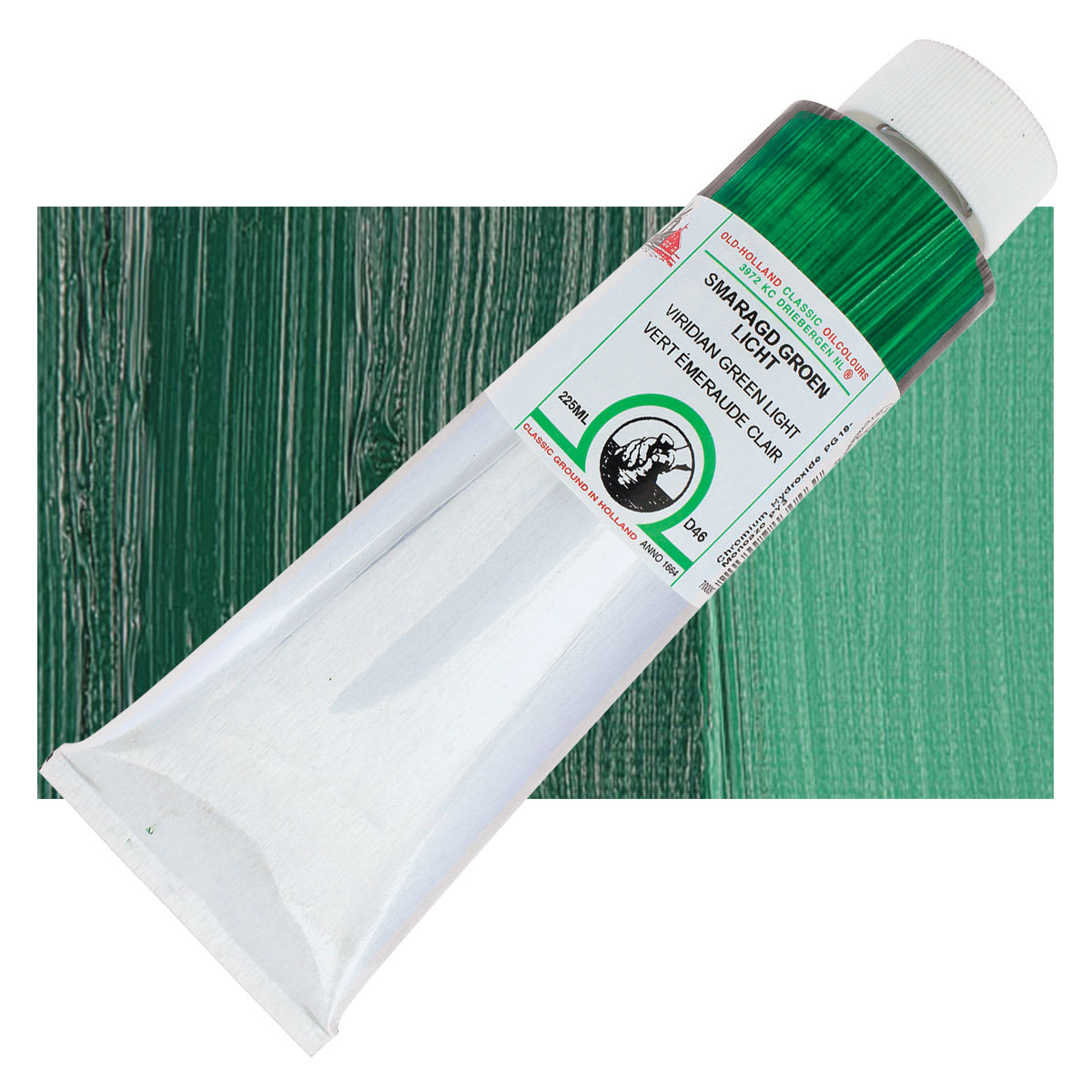 Viridian is the standard green and is stable, powerful, and cold with an emerald green undertone. It has a transparent hue, good tinting strength, a dark masstone that can be almost black at full strength, and a slow drying time in oil form. Viridian is commonly replaced by the darker, more saturated, and staining Phthalo Greens, but its properties make it a necessary part of the palette of an experienced landscape painter.