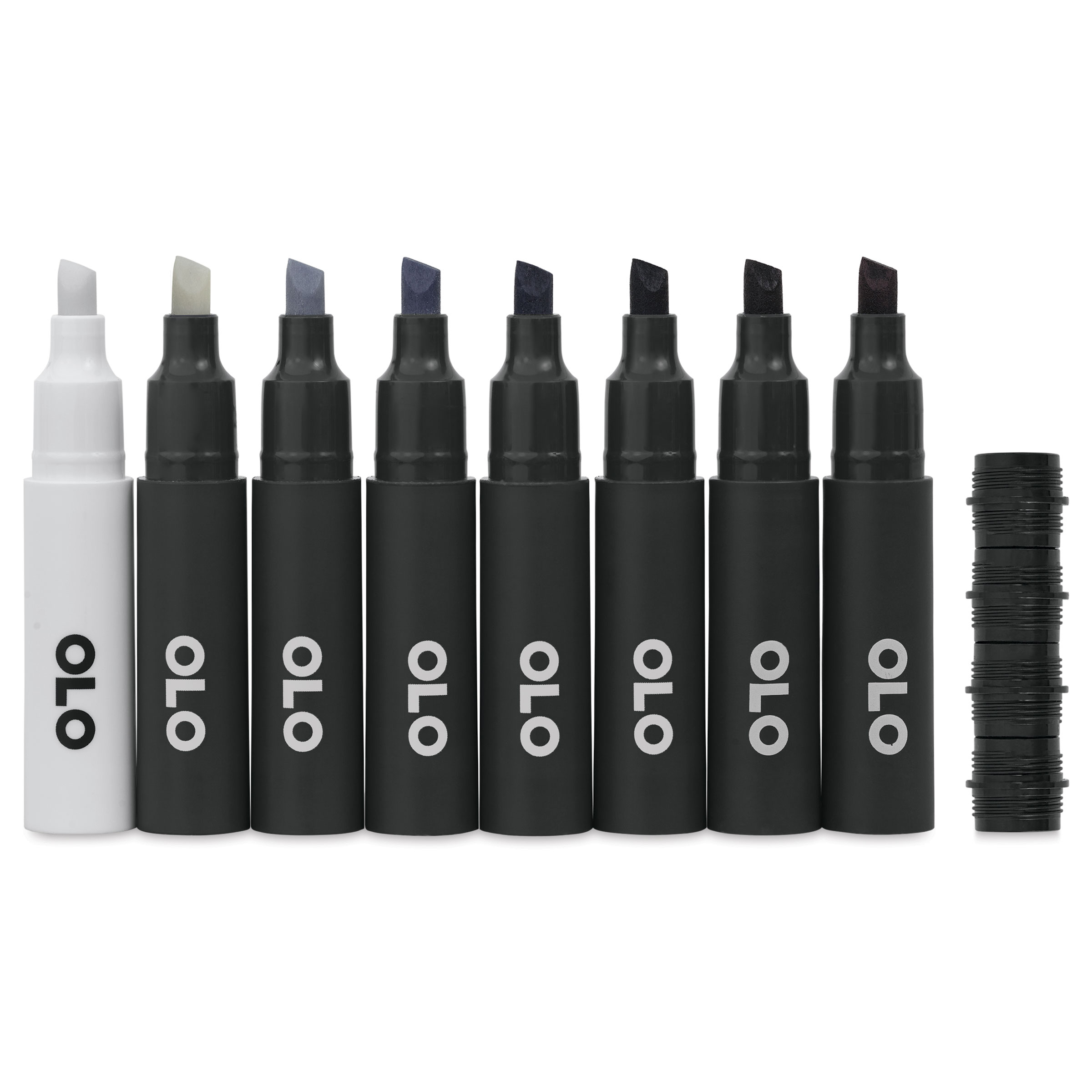 Includes 8 Chisel Tip Half Markers, 4 Connector Rings, and a mini blank swatch card. Colors include Cool Gray 0, Cool Gray 1, Cool Gray 3, Cool Gray 5, Cool Gray 7, Cool Gray 9, BK Blue Black, and a Zero Blender.