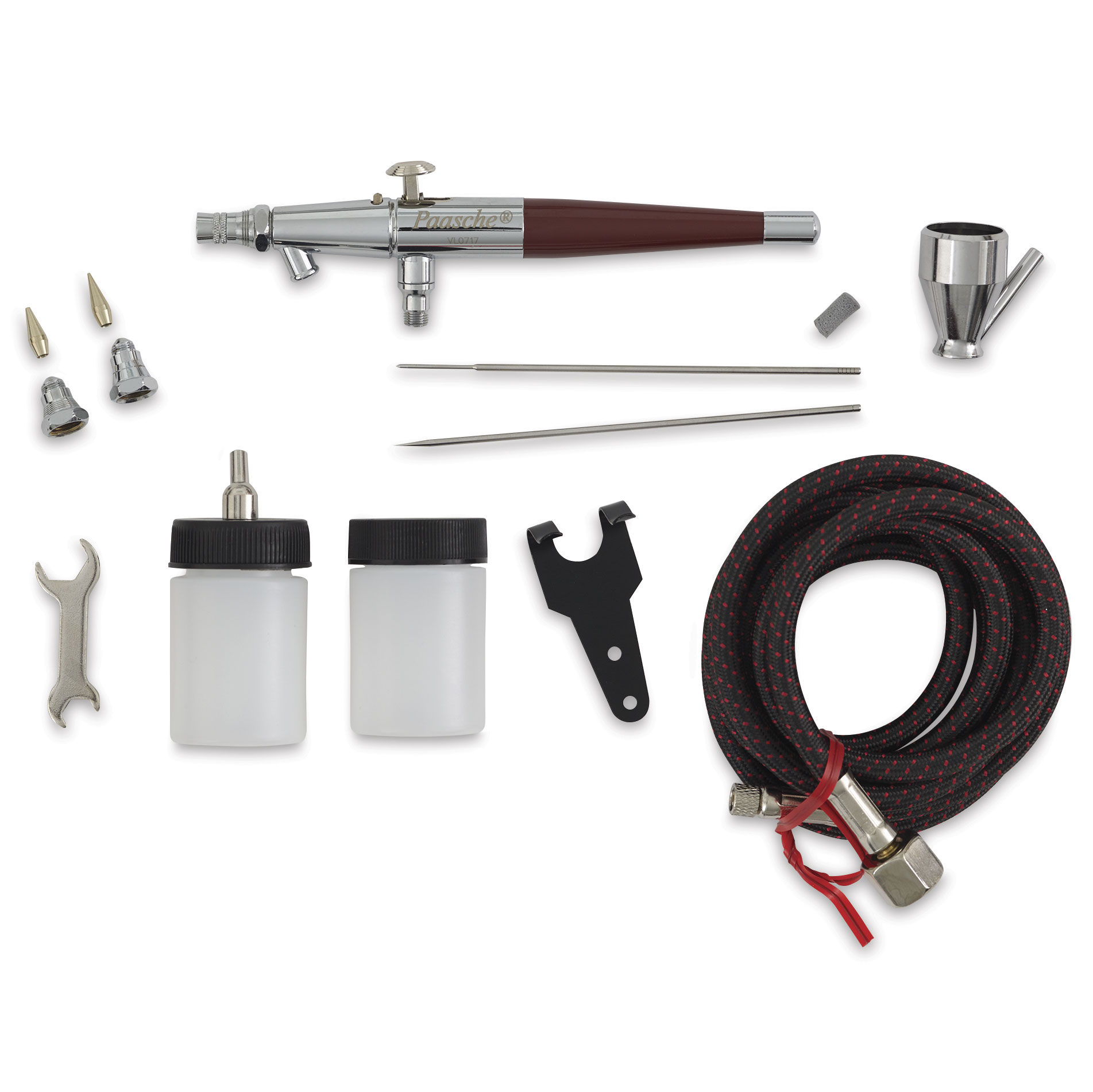 Includes the VL Airbrush with three heads, size 1 (0.55 mm) for light fluids, size 3 (0.74 mm) for medium fluids, and size 5 (1.05 mm) for heavy fluids, plus 1 oz bottle assembly, 1/4 oz metal cup, 1 oz storage bottle, 6 ft braided hose, hanger, wrench, and lessons book. This set provides a spray pattern of 1/32" to 1-1/2".
