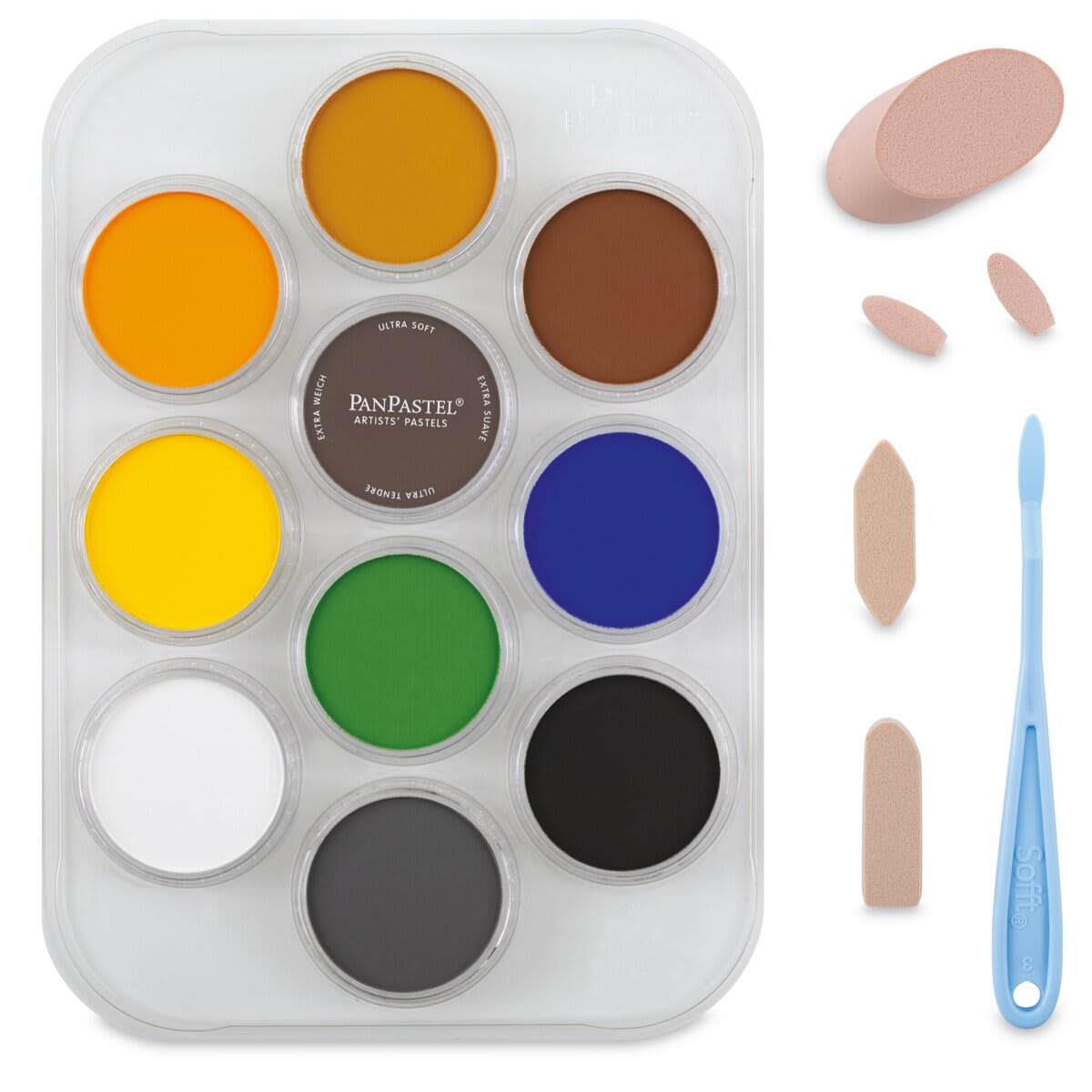 Inspired by UK-based wildlife artist Jason Morgan, this set includes 10 PanPastel colors (Black 800.5, Burnt Sienna Extra Dark 740.1, Burnt Sienna Shade 740.3, Chromium Oxide Green 660.5, Diarylide Yellow 250.5, Neutral Gray Extra Dark 820.2, Orange Shade 280.3, Orange 280.5, Titanium White 100.5, and Ultramarine Blue 520.5), plus a palette tray and six Sofft tools (a No. 3 Oval Painting Knife, two No. 3 Oval Covers, a double-ended Sponge Bar, a Point Sponge Bar, and a Round Angle Slice).