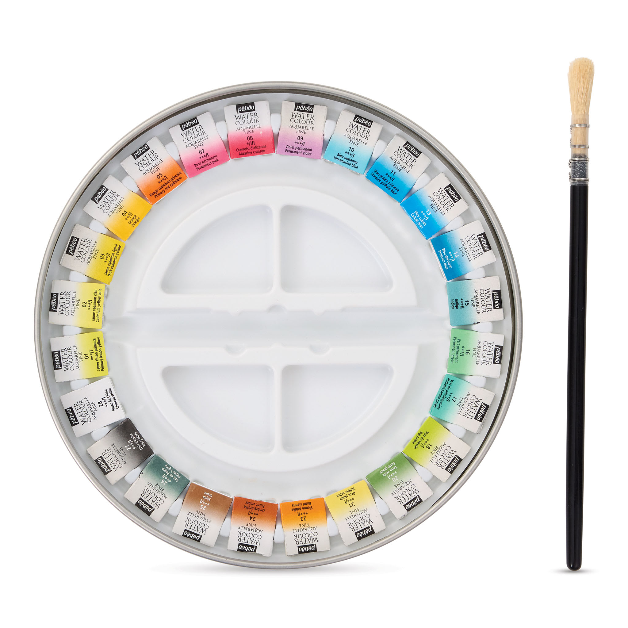 Includes Primary Lemon Yellow, Cadmium Yellow Pale, Primary Red Cadmium, Alizarin Crimson, Primary Phthalo Blue, Cobalt Blue, Permanent Green, Earth Green, Yellow Ochre, Burnt Sienna, Burnt Umber, Ivory Black, Cadmium Yellow Deep, Orange, Permanent Pink, Permanent Violet, Ultramarine Blue, Prussian Blue, Indigo, Phtalocyanine Green, Sap Green, Sepia, Payne’s Grey, and China White.