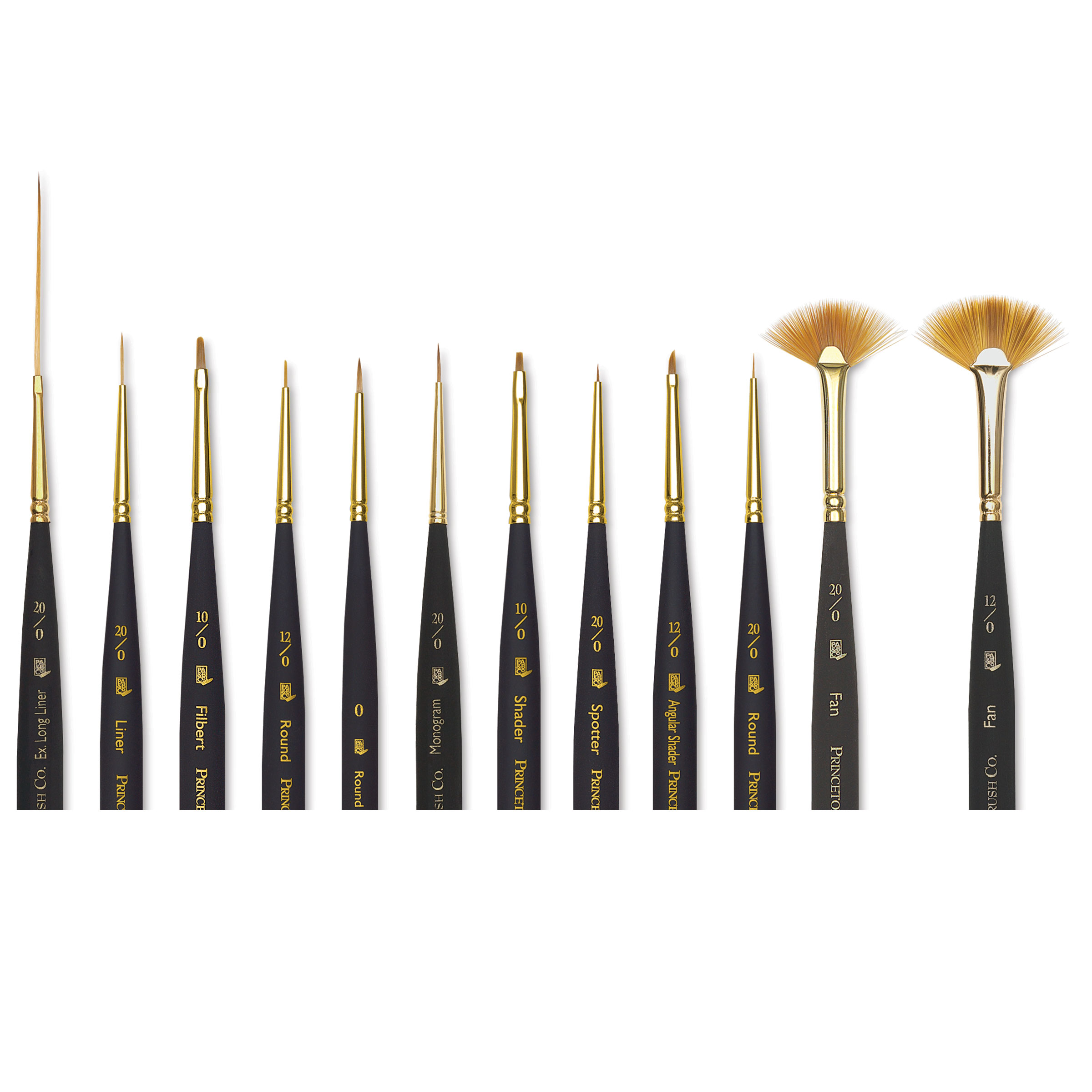 This set includes a 20/0 round, 20/0 fan, 12/0 angular shader, 20/0 spotter, 10/0 flat shader, and a 20/0 monogram brush. It also includes a 12/0 round, 0 round, 10/0 filbert, 12/0 fan, 20/0 liner, and a 20/0 extra long liner.