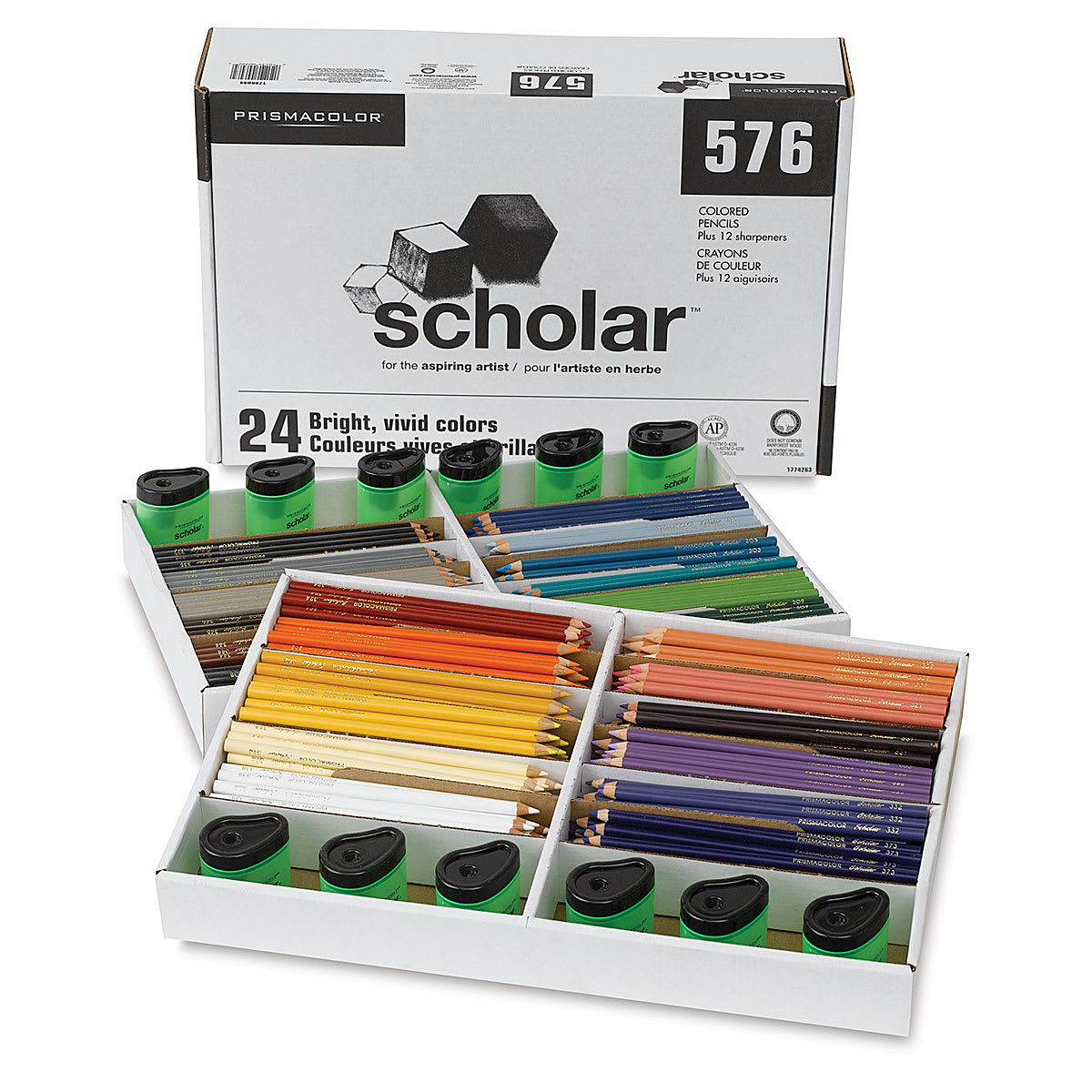 Includes a sturdy cardboard box with divided trays containing 576 colored pencils, 24 each of Black, Medium Cold Grey, Pale Cold Grey, Dark Brown, Terra Cotta, Dark Green, Grass Green, Pale Green, Aquamarine, Permanent Blue, Cloud Blue, Copenhagen Blue, Porcelaine Blue, Light Violet, Purple, Pink, Light Pink, Peach, Crimson Red, Orange, Yellow Ochre, Canary Yellow, Cream, and White, as well as 12 sturdy sharpeners.