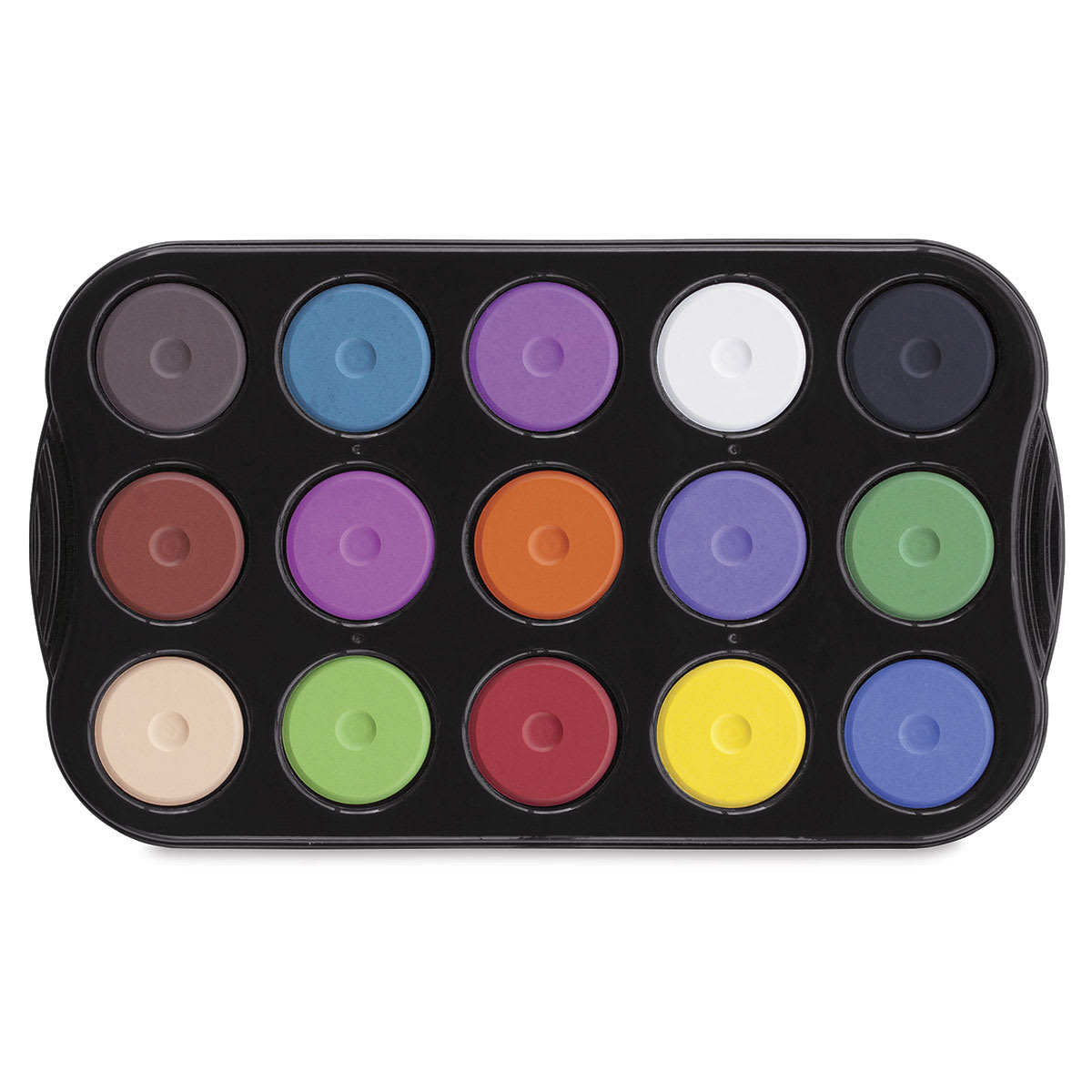Includes Black, Blue, Burnt Sienna, Burnt Umber, Cerise, Flesh, Green, Leaf Green, Orange, Purple, Red, Turquoise, Violet, White, and Yellow mini cakes. This tray fits in the Tempera Rack (sold separately).