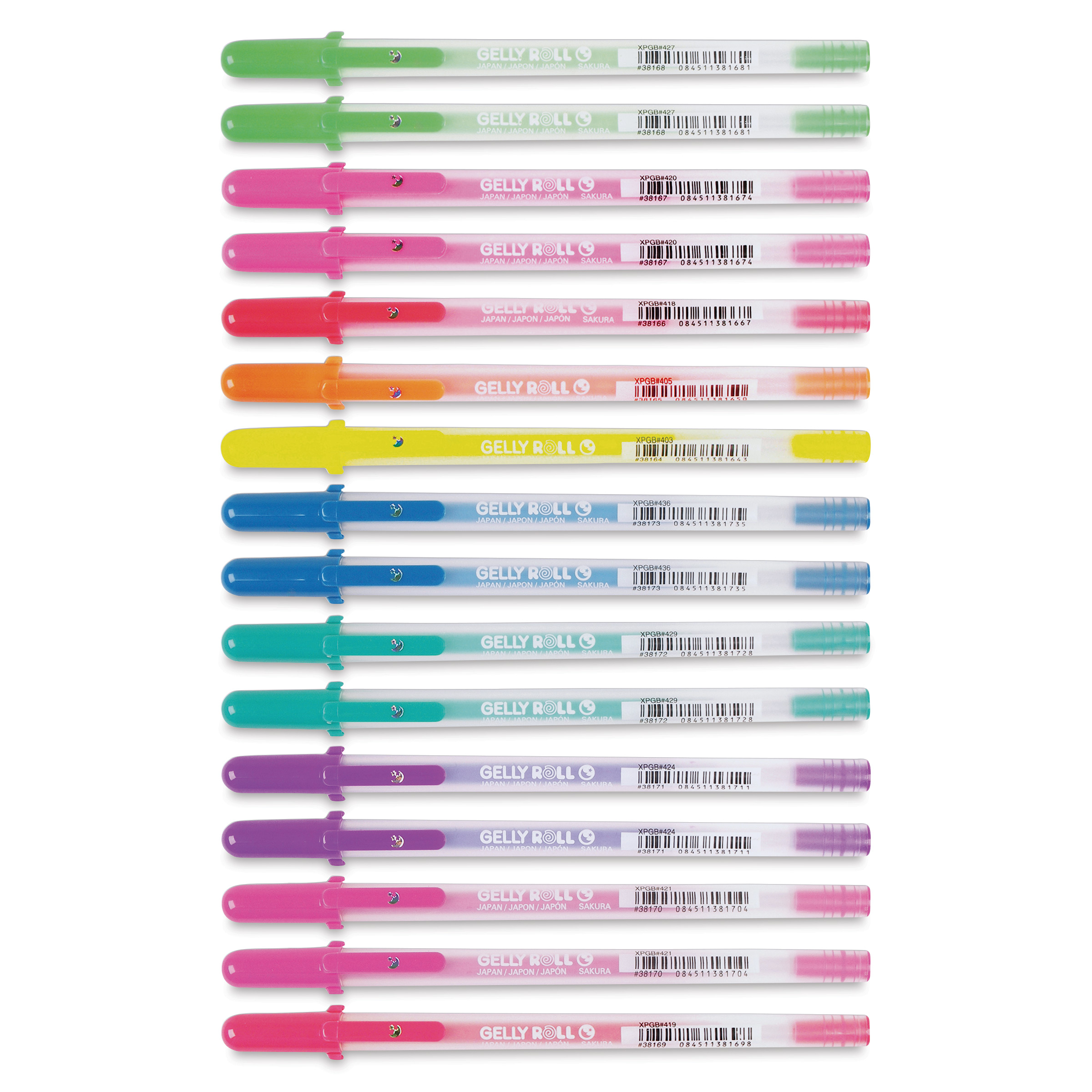 This set contains Fine point pens in one each of colors: Fluorescent Yellow, Fluorescent Orange, Fluorescent Vermilion, and Red; and two each of Fluorescent Pink, Fluorescent Green, Rose, Purple, Green, and Blue.