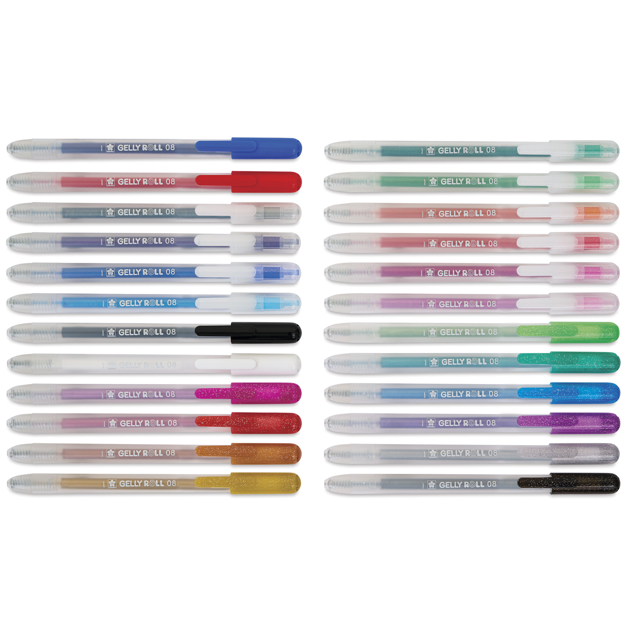 This set includes Classic Black, Classic White, Classic Red, Classic Blue, Metallic Gold, Metallic Silver, Metallic Green, Metallic Lime, Metallic Blue, Metallic Purple, Metallic Pink, Metallic Red, Metallic Copper, Metallic Black, Stardust Silver, Stardust Pink, Stardust Rose, Stardust Purple, Stardust Sky Blue, Stardust Blue, Stardust Green, Stardust Lime, Stardust Red, Stardust Orange, and a special edition pen case