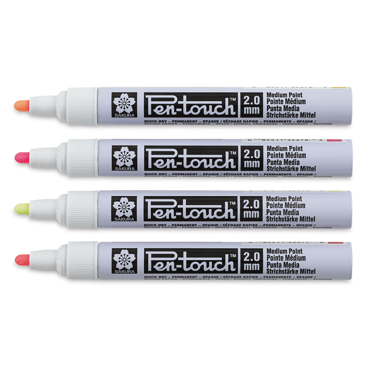 Includes Fluorescent Yellow 302, Fluorescent Orange 305, Fluorescent Red 319, and Fluorescent Pink 320 all with a 2.0 mm Medium Tip.