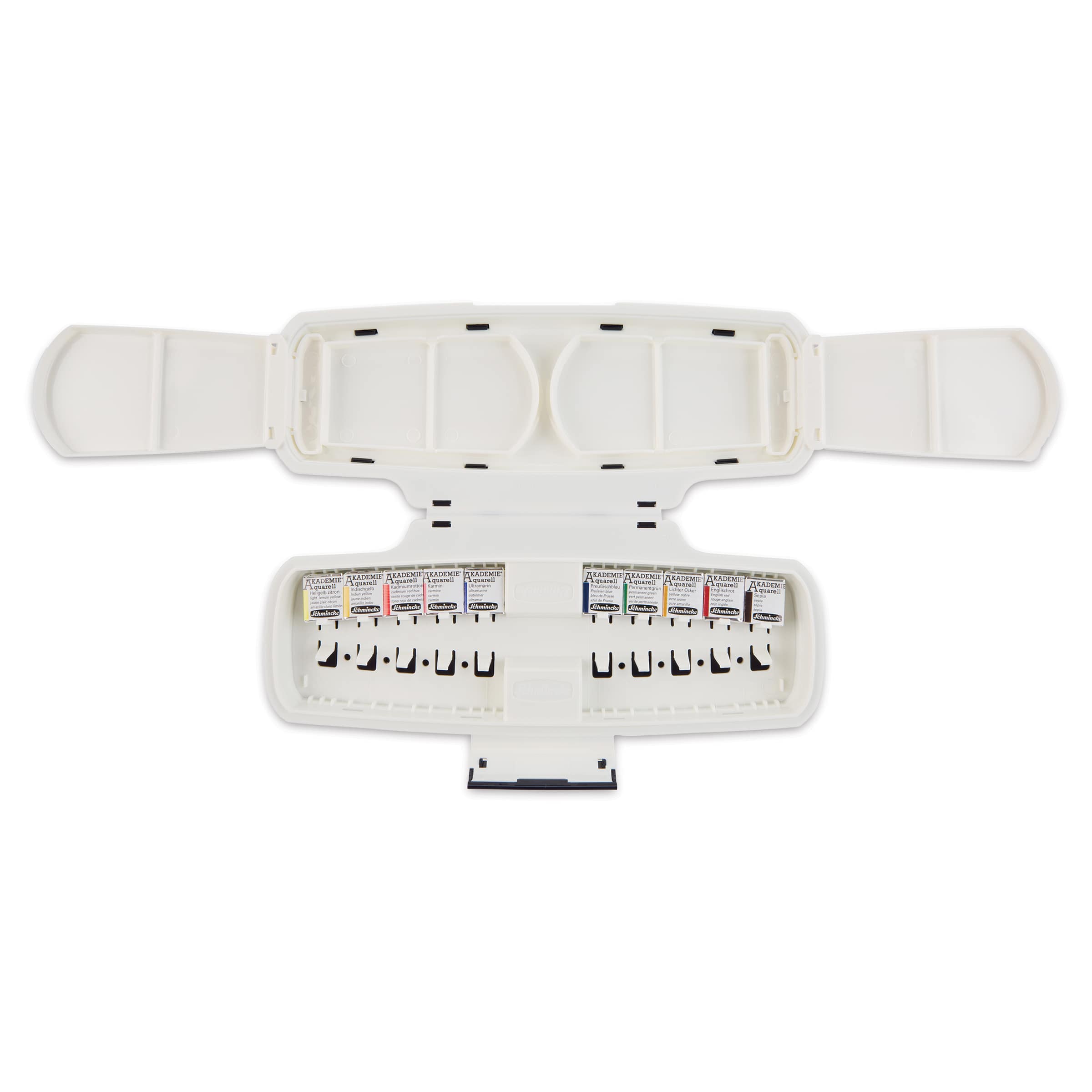 With fold-out mixing palettes, this is an ideal beginner’s box for watercolor painting. It contains 10 essential colors, plus space for an additional 10 half pans. Colors include Light Lemon Yellow, Indian Yellow, Cadmium Red Hue, Carmine, Ultramarine, Prussian Blue, Permanent Green, Yellow Ochre, English Red, and Sepia.