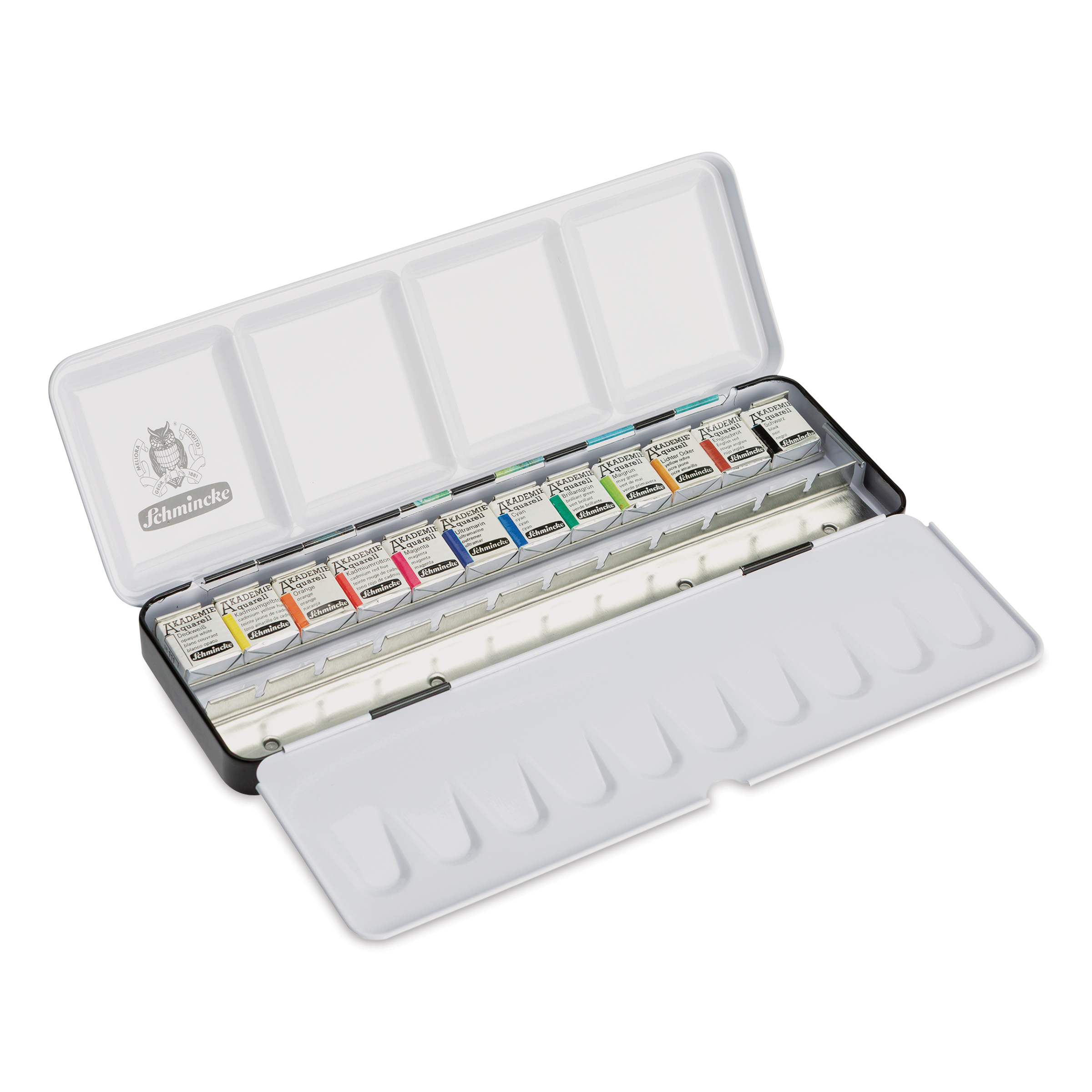 12 half pan watercolors-and room for 12 more-are presented in a metal case featuring "On the Surface", the artwork of 2024 Watercolor Contest Winner, Arina Abramova. The 12 included colors are Light Lemon Yellow 222, Indian Yellow 225, Cadmium Red Hue 332, Carmine 333, Ultramarine 443, Prussian Blue 445, Brilliant Green 551, Permanent Green 553, Yellow Ochre 660, English Red 666, Sepia 665, and Black 782.