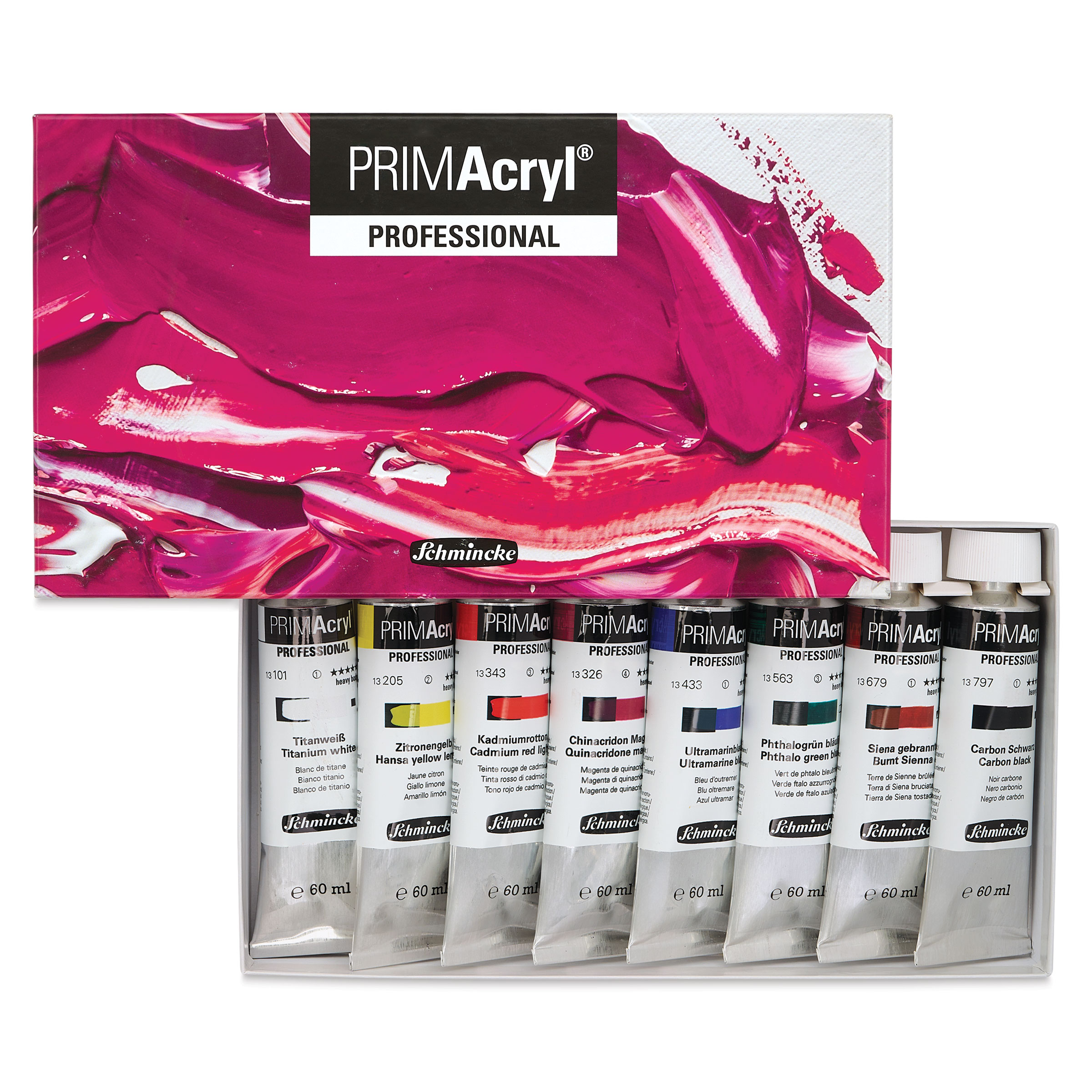 This versatile set provides a balanced palette to support all painting styles. It includes eight colors in 60 ml tubes: Titanium White, Hansa Yellow Lemon, Vermillion Red, Quinacridone Magenta, Ultramarine Blue, Phthalo Green Bluish, Burnt Sienna, and Carbon Black.