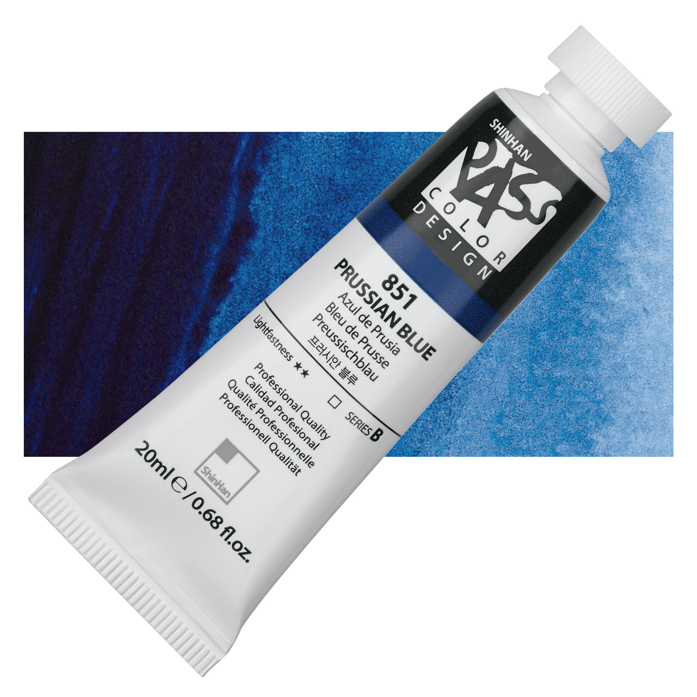 Prussian Blue is a semi-transparent, deep cyan-blue with a greenish undertone and a very high tinting strength unequaled by most pigments. It is similar to Phthalo Blue unless mixed with white, when it gives up intensity and becomes smoky. It can behave erratically and less reliably in oil and watercolor form depending on its manufacture. For permanent painting Phthalo Blue is considered a more reliable choice.