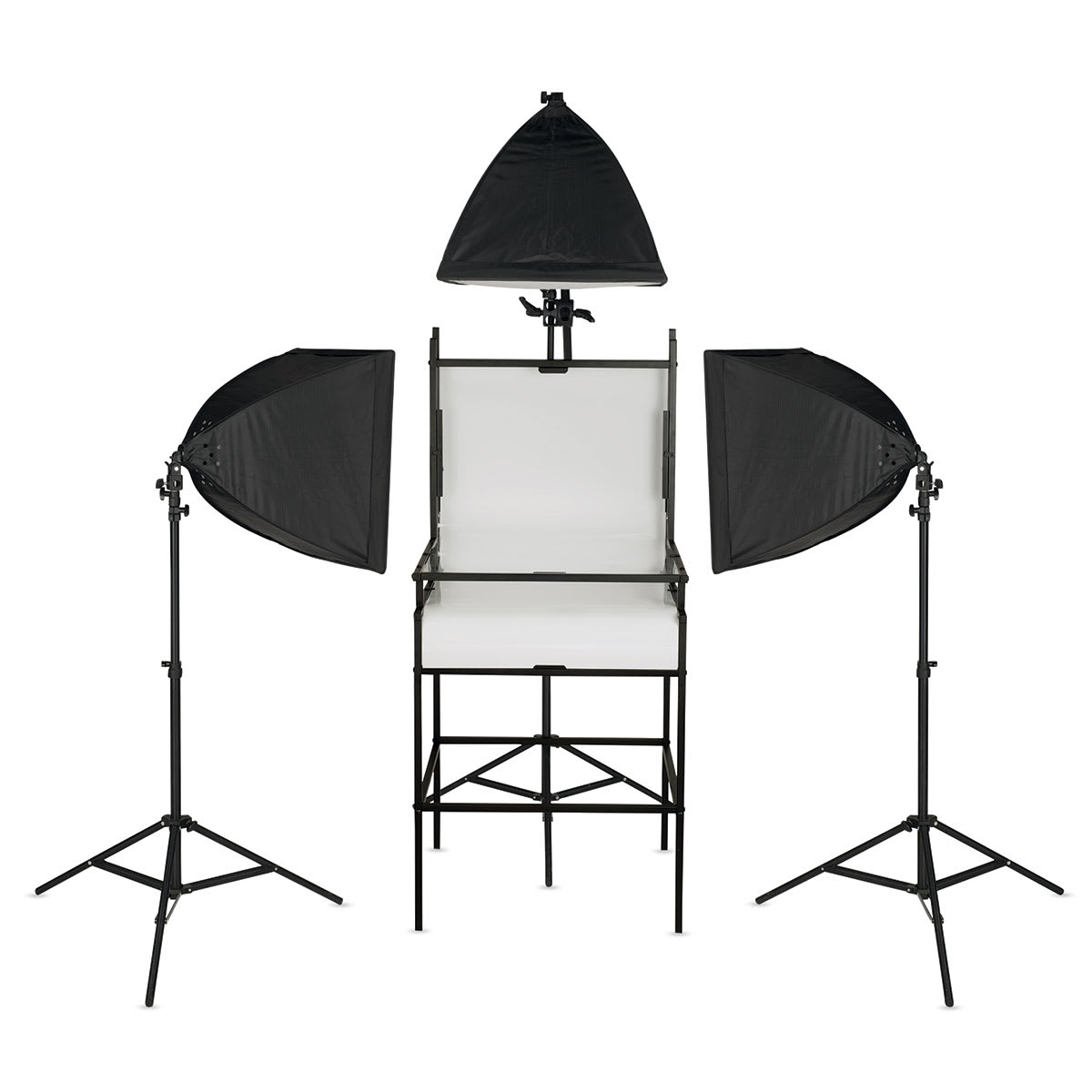 Includes ST24 base module frame with opaque plexiglass, CM24 module frame with clear plexiglass, floor stand, three quick-folding 20" x 20" softboxes, three sockets with power cords, three 60W LED bulbs, three diffusers, three 6 ft light stands, boom arm, and a padded carrying/storage case.