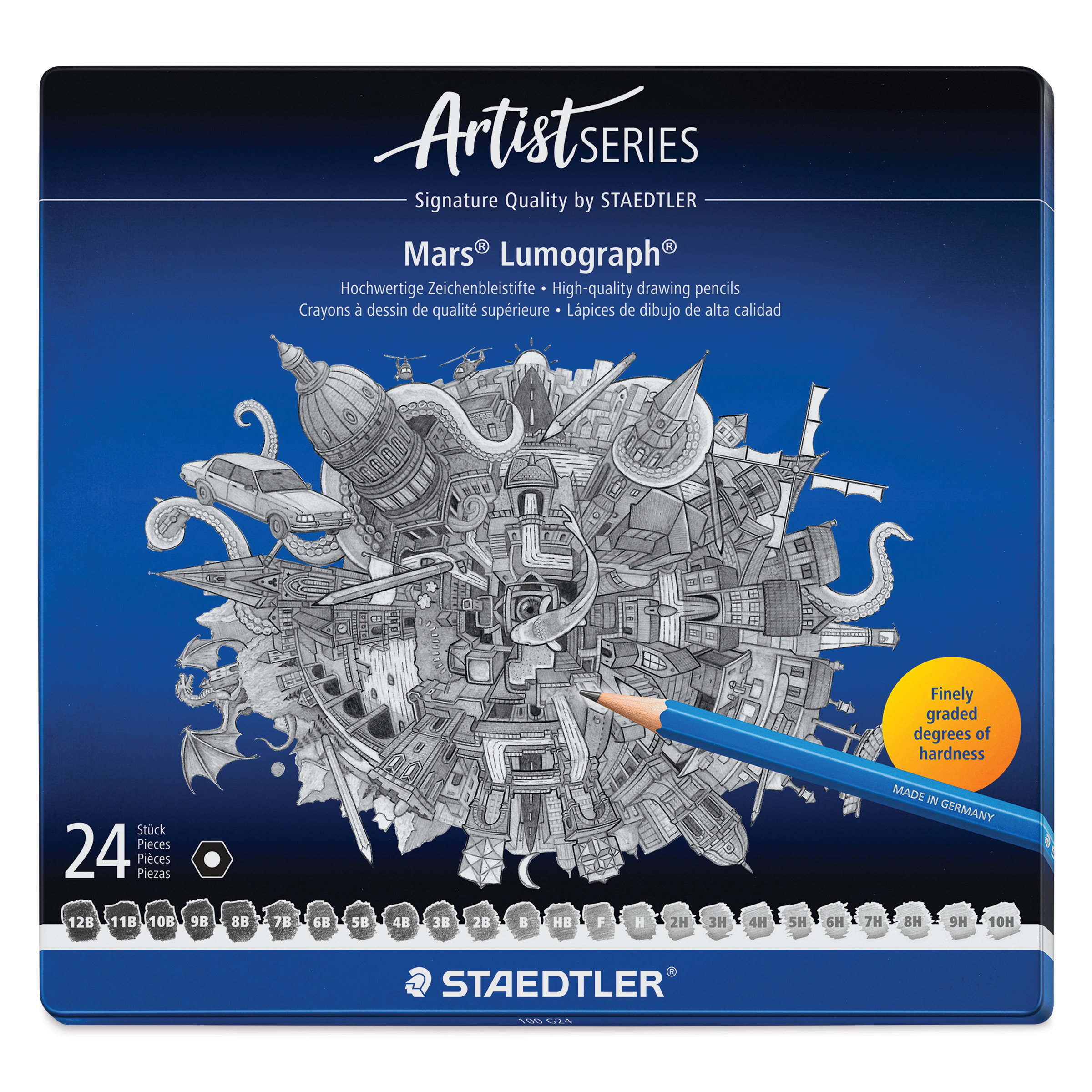 Contains 24 hardness degrees, including 12B, 11B, 10B, 9B, 8B, 7B, 6B, 5B, 4B, 3B, 2B, B, HB, F, H, 2H, 3H, 4H, 5H, 6H, 7H, 8H, 9H, and 10H.