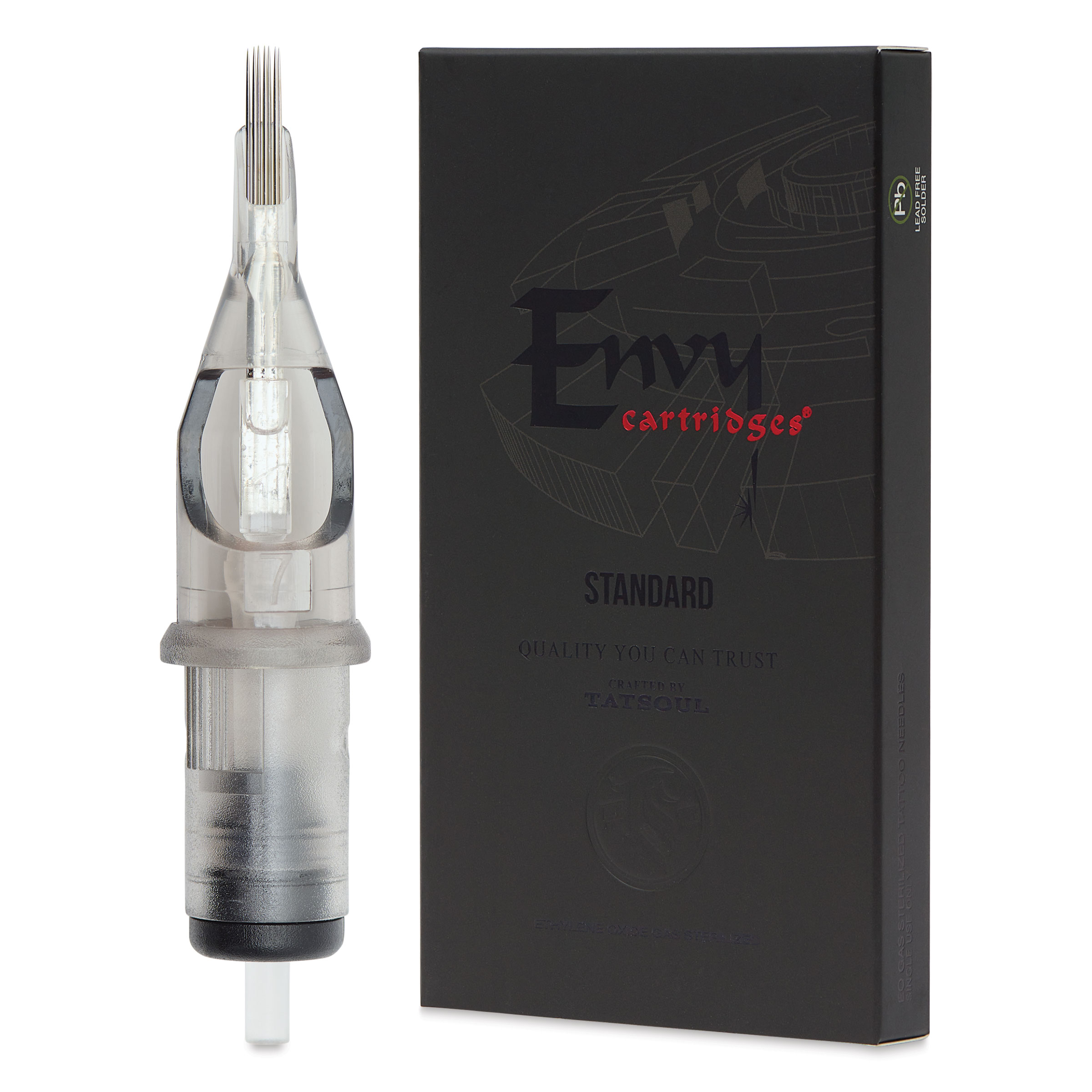 TatSoul Envy Standard Curved Magnum Long Taper Tattoo Needle Cartridge - #12, 7 Needles, Pkg of 10, needle and packaging