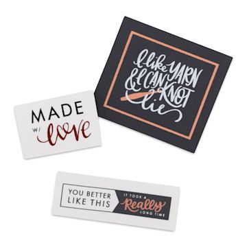 This package contains nine cloth, sew-on project labels. Captions include “made with love,” “you better like this it took a really long time,” and “I like yarn and I can knot lie.” The largest label measures approximately 2"x 1¾".