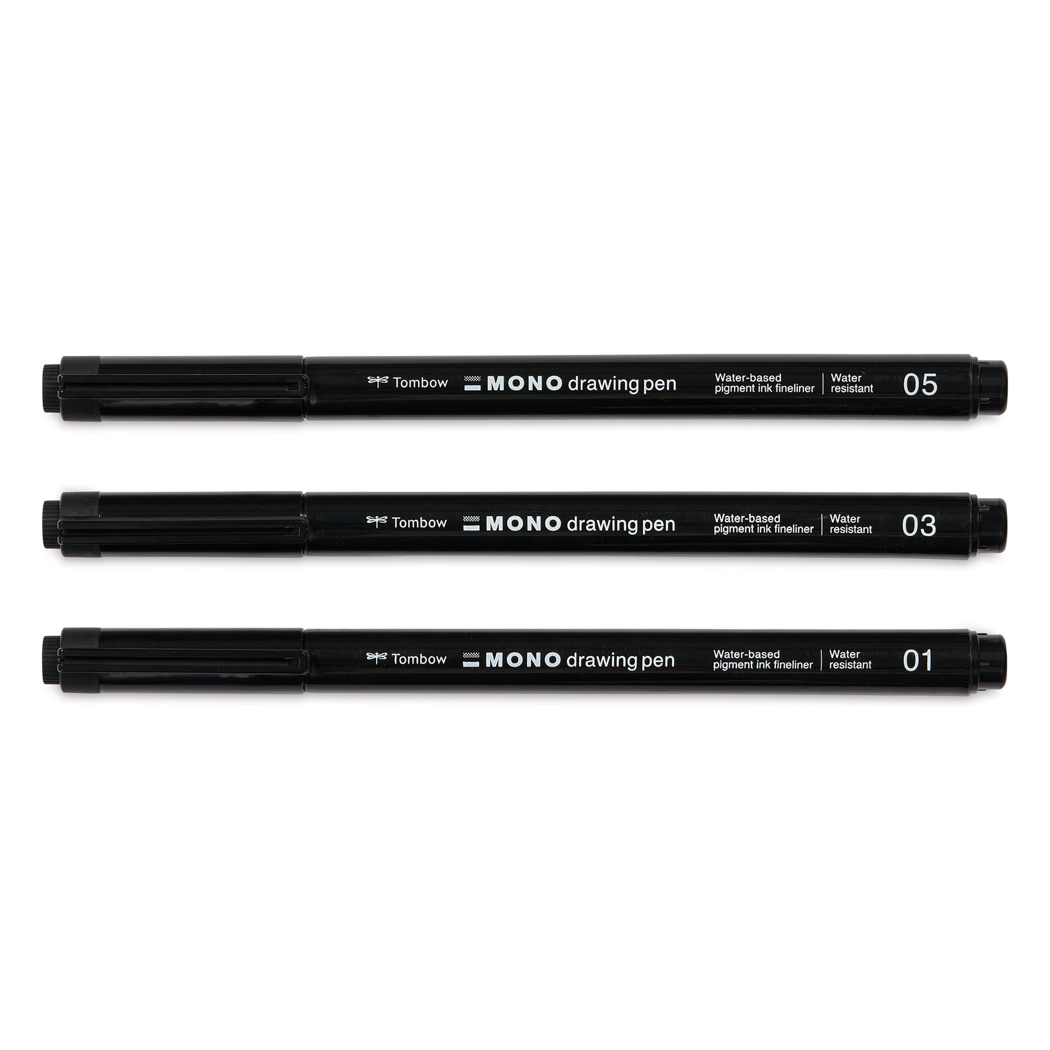 This set includes three drawing pens, one each of 01, 03, and 05 tip sizes for creating bold lines or fine details in illustrations, manga, anime, lettering, journaling, and technical drawings.