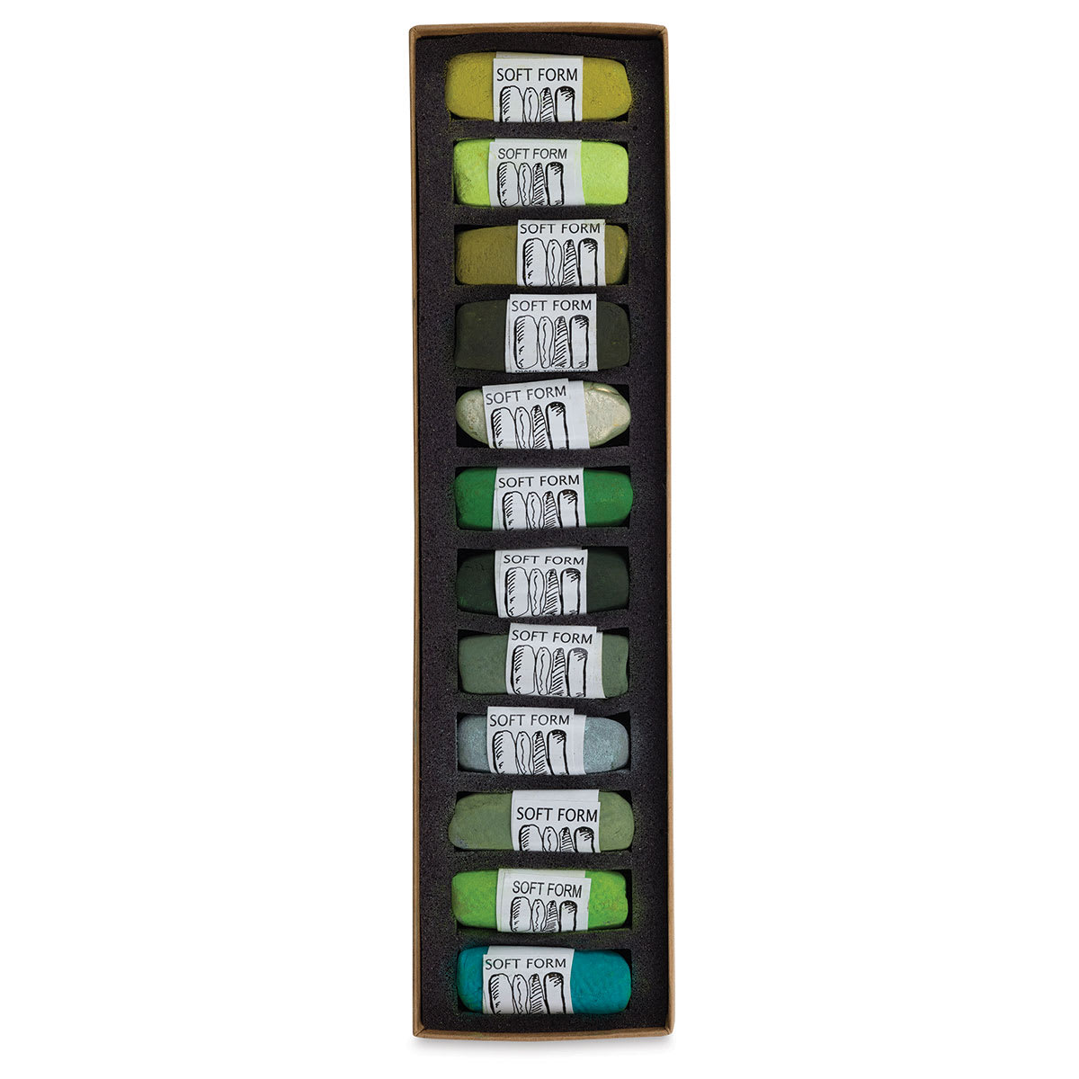 Includes 009 Green Oxide, 027D Permanent Green Medium, 028D Permanent Green Deep, 044 Viridian, 055L Dark Green, 059 Dark Khaki, 090 Pale Green, 091 Moss, 117 Mars Green, 120 Earth Green, 503D Iridescent Green Dark, and 608 Green Light.