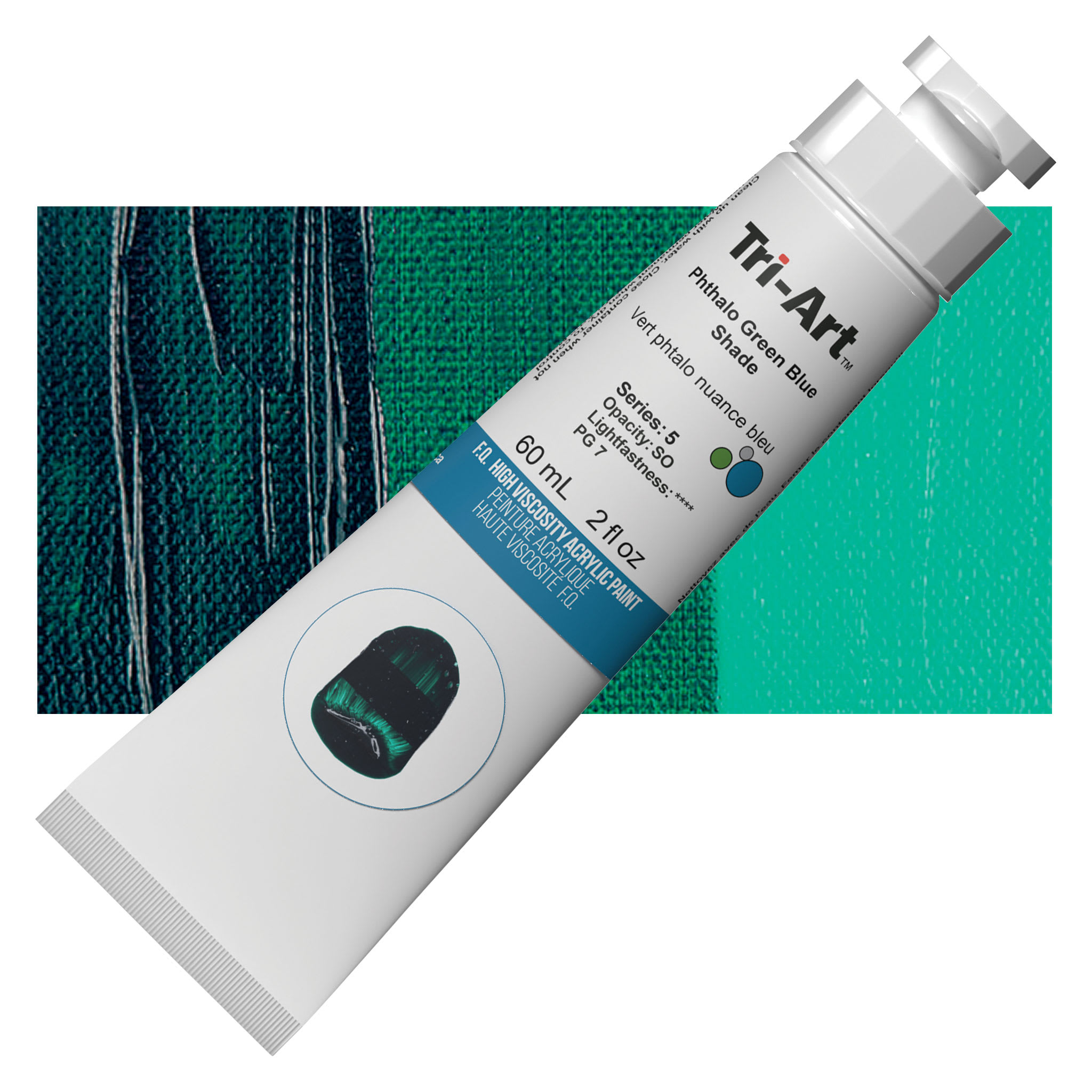 Phthalo Green is a transparent, cool, bright, high intensity color used in oil and acrylics. It comes from a Phthalocyanine Blue pigment where most of the hydrogen atoms have been replaced with chlorine, forming highly stable molecules. It has similar pigment properties and permanence to Phthalo Blue. It is slow drying and an excellent base color for mixing a range of bright greens. Phthalo Green is considered a very good alternative to Viridian because it is intense and mixes well and can be used to emphasize mineral colors in various tints. However, its tinting strength is very high, so it can overpower other colors. This pigment most closely resembles the discontinued and toxic Verdigris.