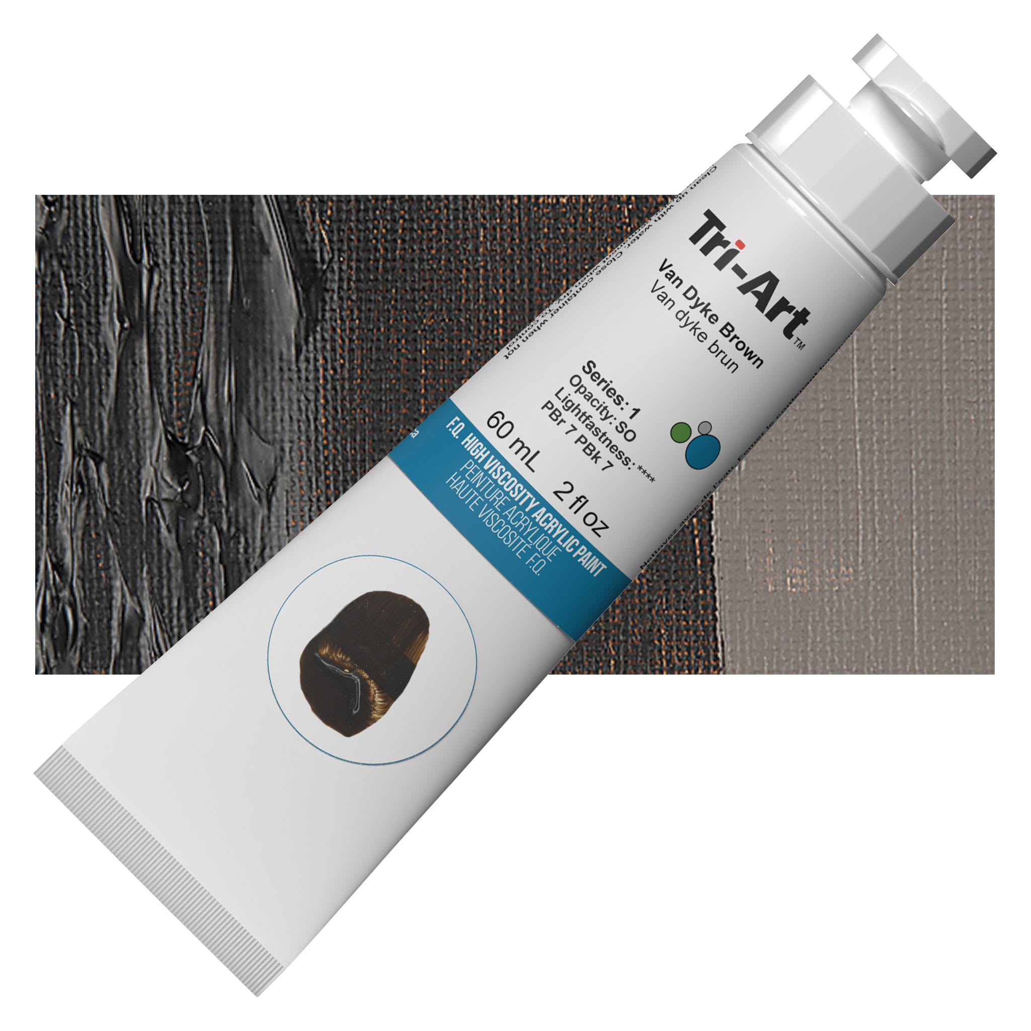 Tri-Art High Viscosity Artist Acrylic - Van Dyke Brown, 60 ml tube and swatch