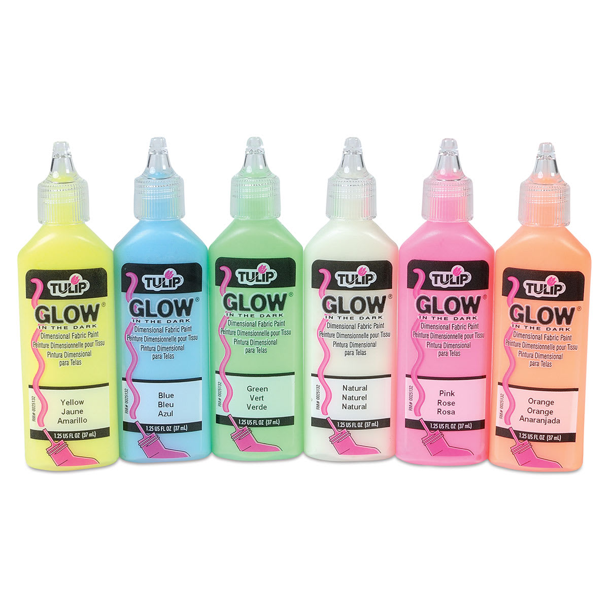 These luminous paints dry with a fun glow-in-the-dark finish. Includes one 1.25 oz bottle each of Yellow, Blue, Green, Natural, Pink, and Orange.