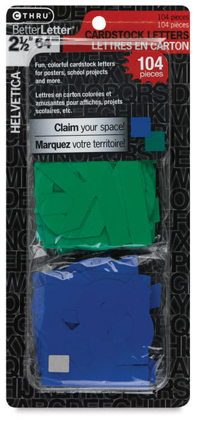 The set includes a total of 104, 2½" (64 mm) Helvetica letters — two full alphabets each in the colors Blue and Green.