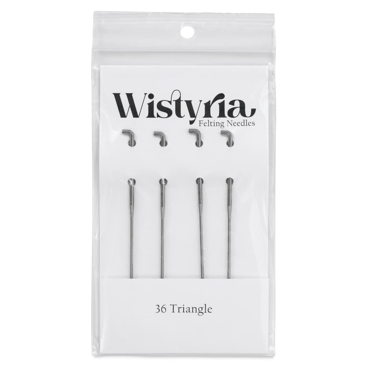 Includes four 36-gauge triangle needles, measuring 3.5" in length. The 36-gauge needle is used for faster, coarse felting and leaves a larger hole in the felted surface.