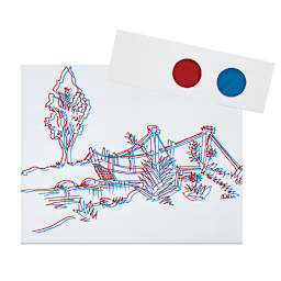 Make a composition for viewing with 3-D glasses! Turn an original drawing into a three-dimensional anaglyph using red and blue transfer paper with red and blue markers. Then, make the 3-D glasses necessary to make it pop!