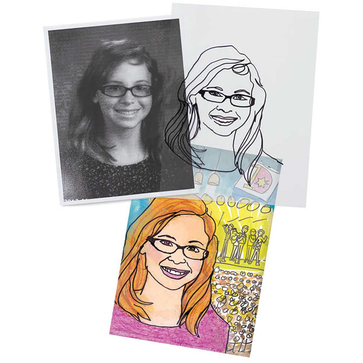 Creating self portraits is a snap with this easy technique! Facial proportions and features are traced onto clear film, then layered over a background of a student’s own choosing — a location where she or he would most like to take a “selfie.”