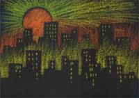 Stencil City is a place that only exists on paper. It is created by cutting stencils in shapes of buildings and then using them to create areas of color against a black background. The end result is a nightglow cityscape.