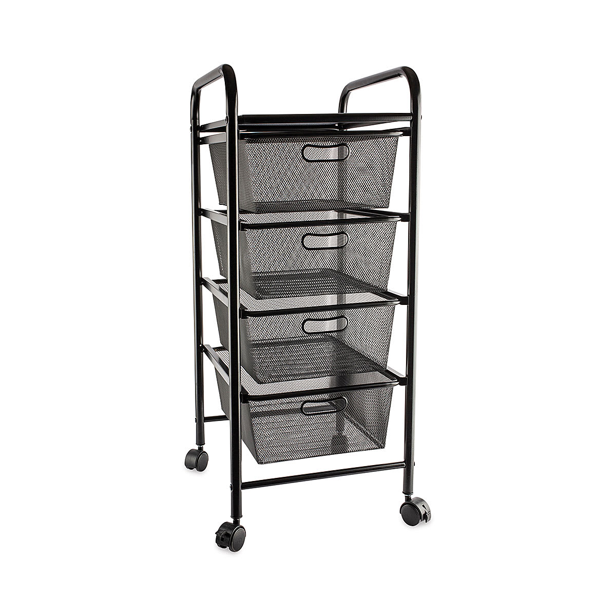 Keep your supplies organized in the Alvin Black Mesh Storage Cart. It has a unique, patented interlocking rail and drawer system that prevents drawers from shifting off their rails. The four drawers have molded stops, which block the drawers from pushing through the back of the cart. It rolls on ...